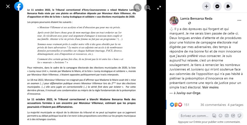Ce mardi 11 octobre 2022, le Tribunal correctionnel d’Évry-Courcouronnes jugeait Lamia BENSARSA REDA (LBR) pour des faits de diffamation publique, relativement à un tract litigieux visant son opposant Alain VILLEMEUR, diffusé par elle pendant la campagne des élections municipales 2020.