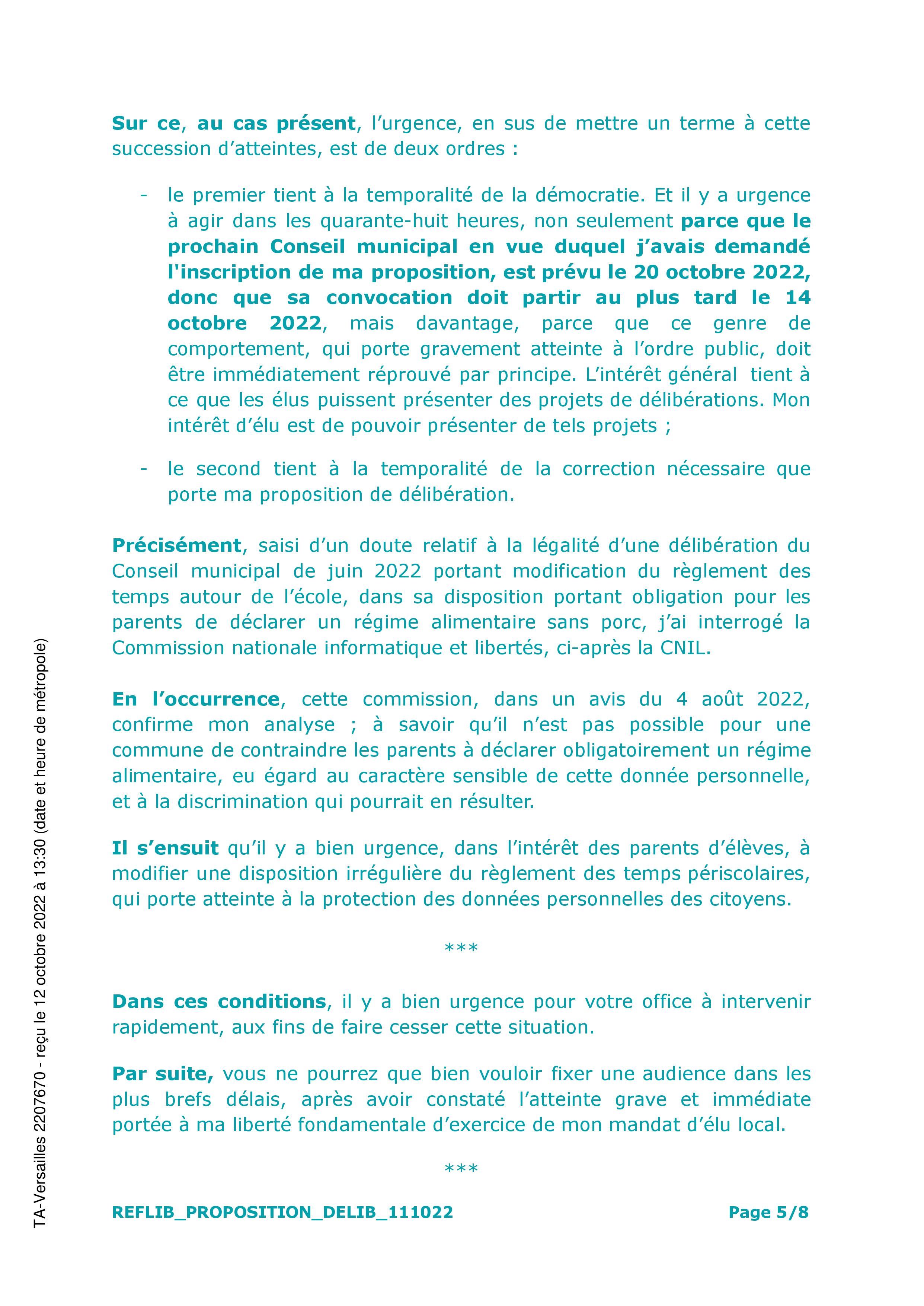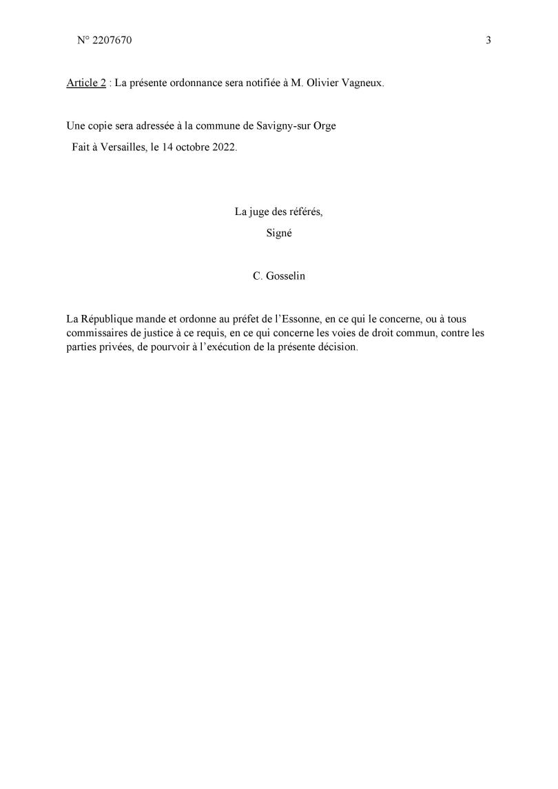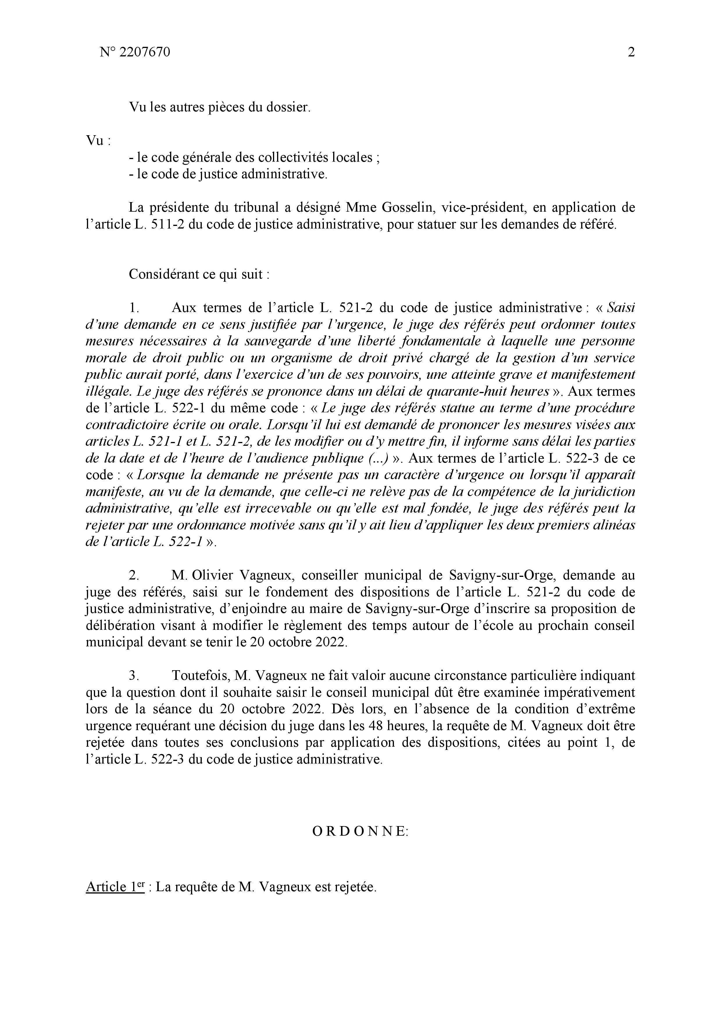 Ce référé est rejeté parce que le juge, qui a dû survoler la page 5 de ma requête, prétend que je n’ai pas démontré l’extrême urgence à proposer ma délibération impérativement pour le prochain conseil…