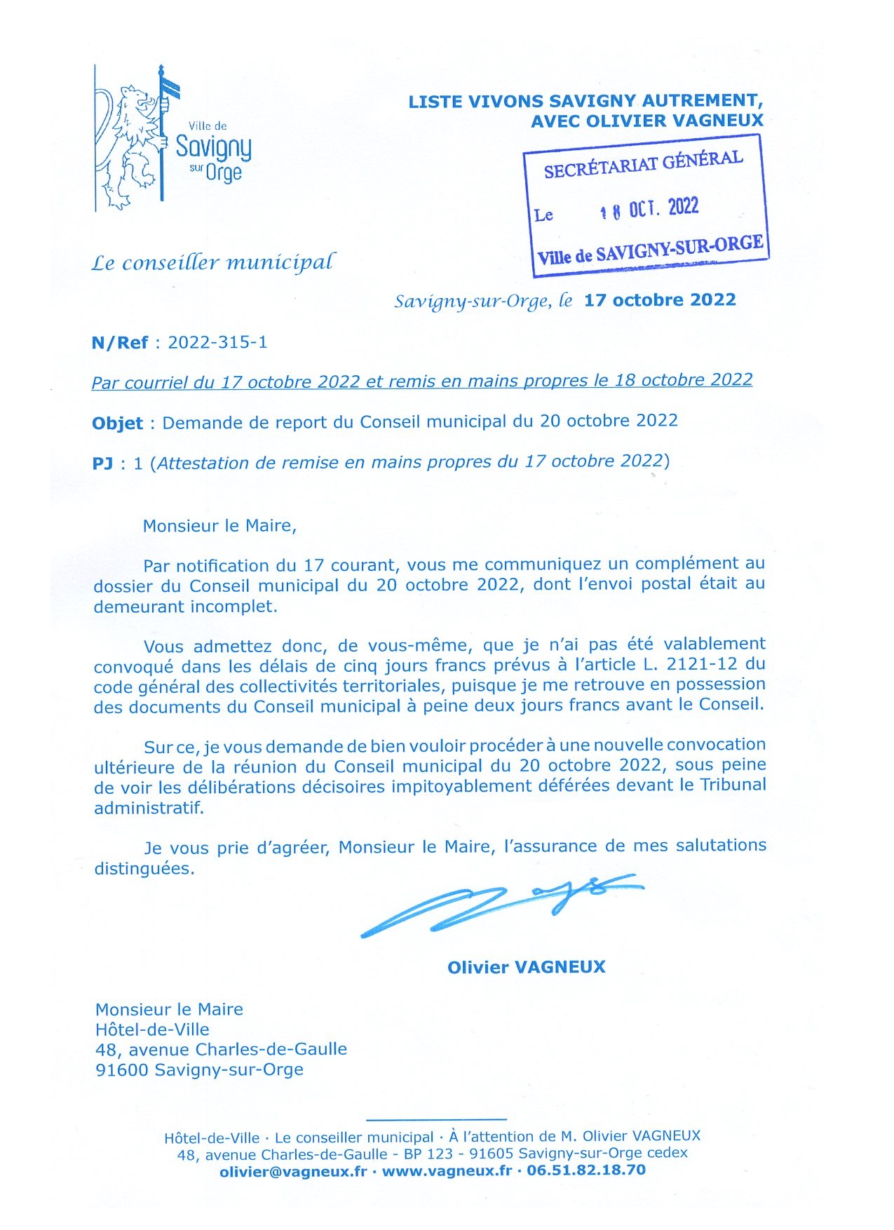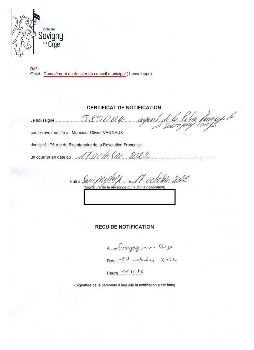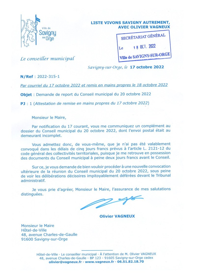 Évidemment, à Savigny, ils me l’envoient toujours le dernier jour du délai, le cachet de la Poste faisant foi, au tout dernier moment, pile exprès pour que je ne l’ai pas lors de la fin de semaine précédant le conseil.