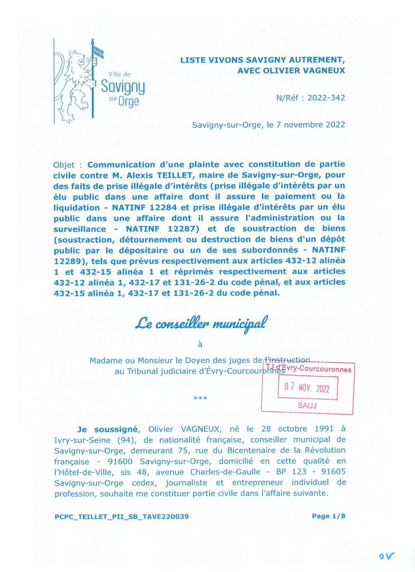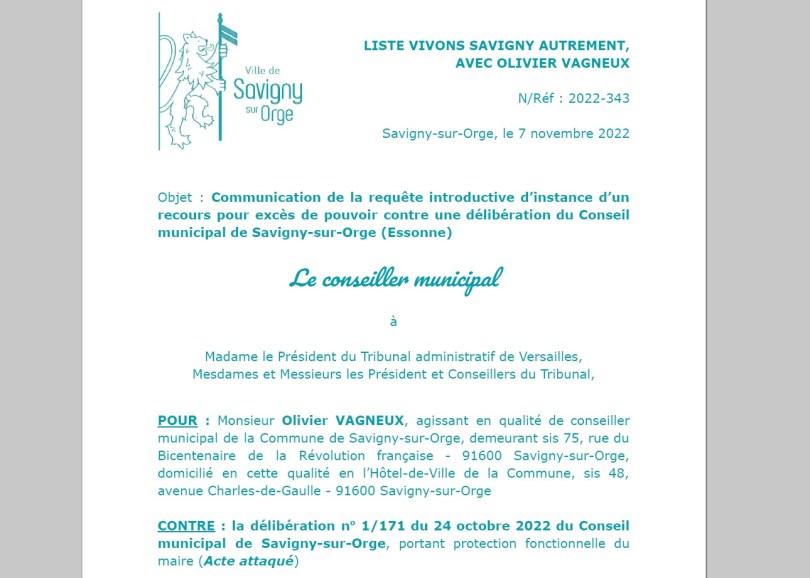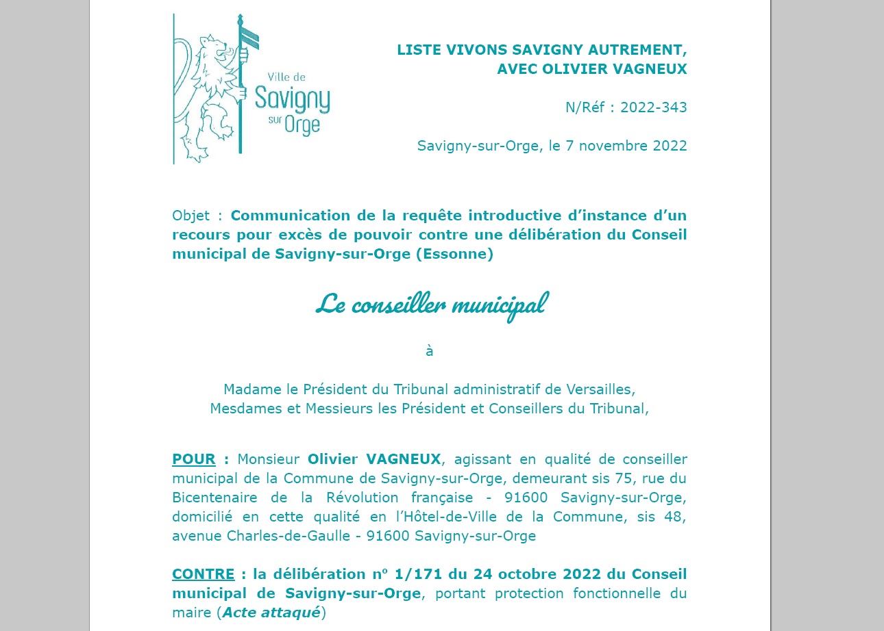 I.1. Au cours de la séance du Conseil municipal de Savigny-sur-Orge (Essonne) du 24 octobre 2022, a été appelée à l’ordre du jour une délibération portant octroi du bénéfice de la protection fonctionnelle au maire, M. Alexis TEILLET, aux fins de lui permettre de poursuivre pénalement une personne qui le victimise de propos litigieux, injurieux et outrageants.