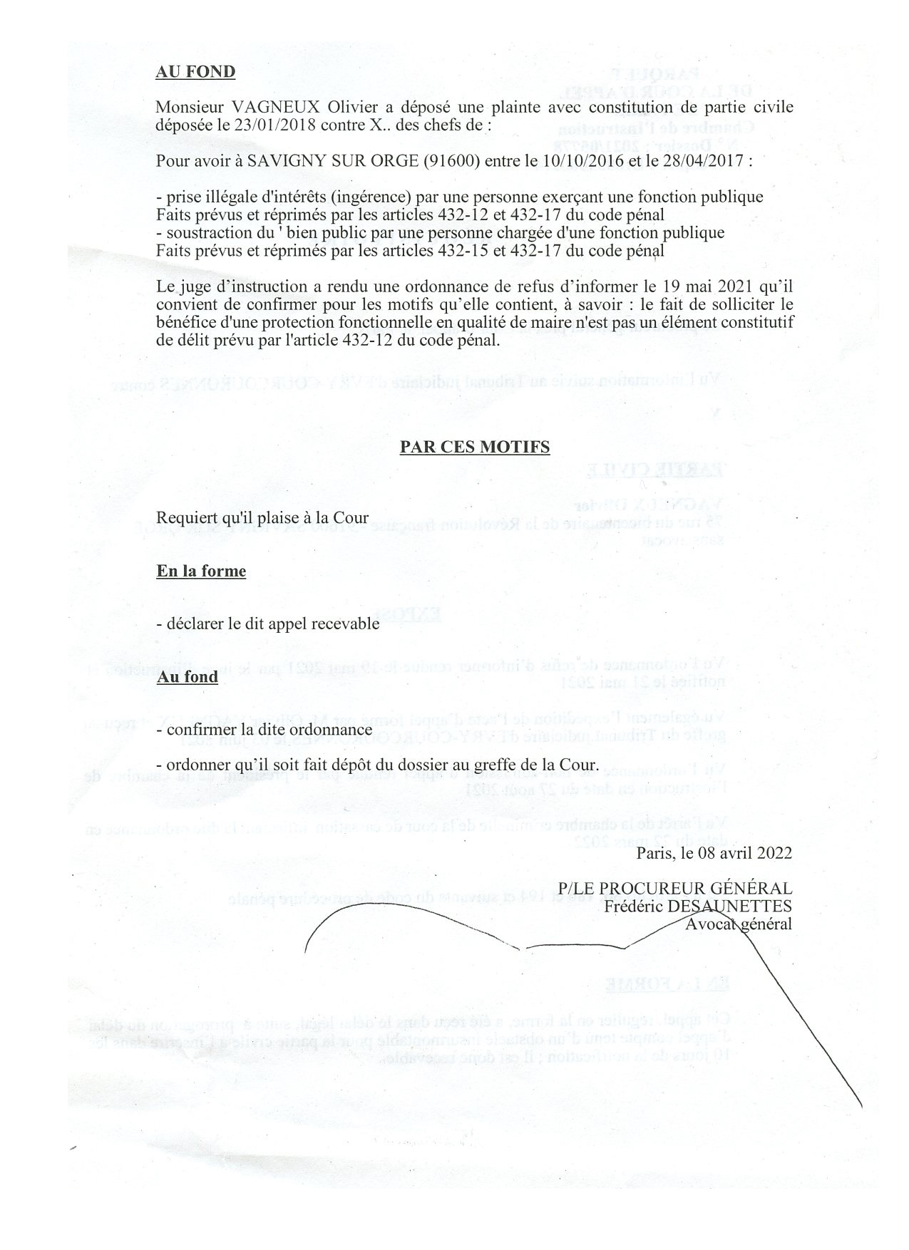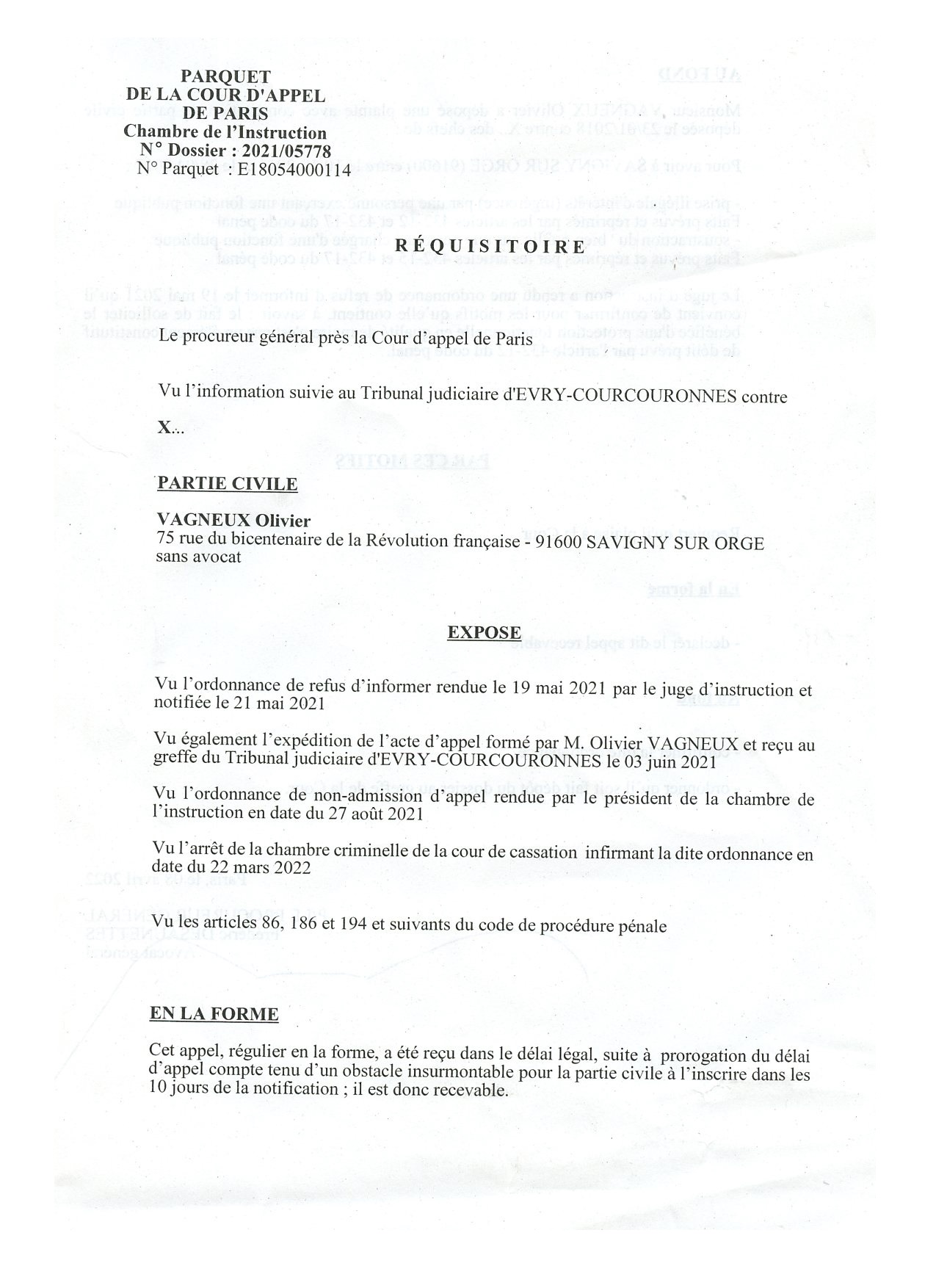 Précisons que, comme souvent, cet arrêt a été rendu contre l’avis de l’avocat général, lequel, dans son réquisitoire, demandait la confirmation de l’ordonnance du juge d’instruction.
