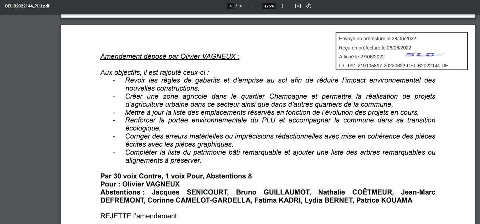 – Le maire dit n’avoir accordé aucun permis, puis quand même celui de Charles-de-Gaulle. Son excuse ne tient pas ; il aurait pu rejeter au droit du PLU les permis déposés sous le mandat de son prédécesseur.