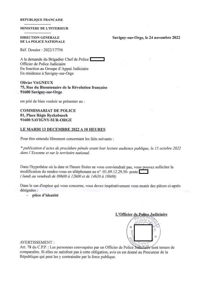 Olivier VAGNEUX, encore convoqué pour être auditionné sur des faits de publication d’actes de procédure pénale avant leur lecture en audience publique