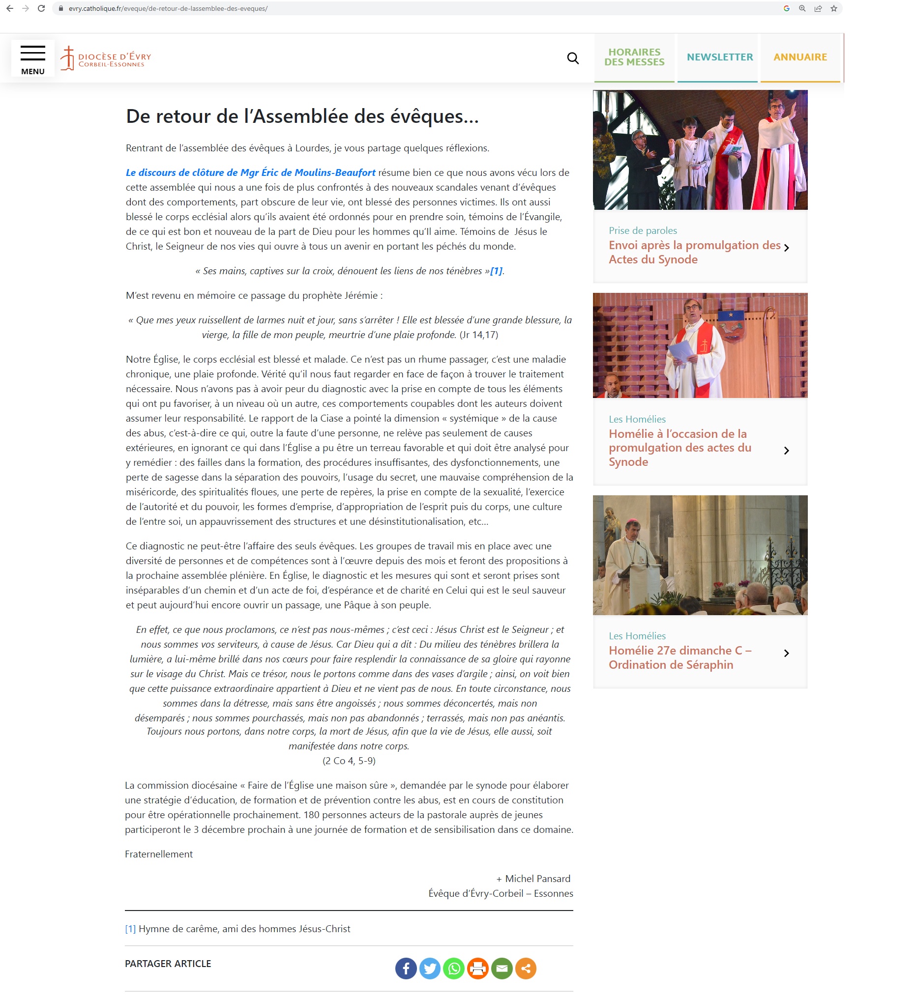Je ne suis clairement pas satisfait du message de Mgr Michel PANSARD, évêque d’Évry-Courcouronnes – Corbeil-Essonnes, de retour de l’Assemblée des évêques à Lourdes en novembre 2022.
