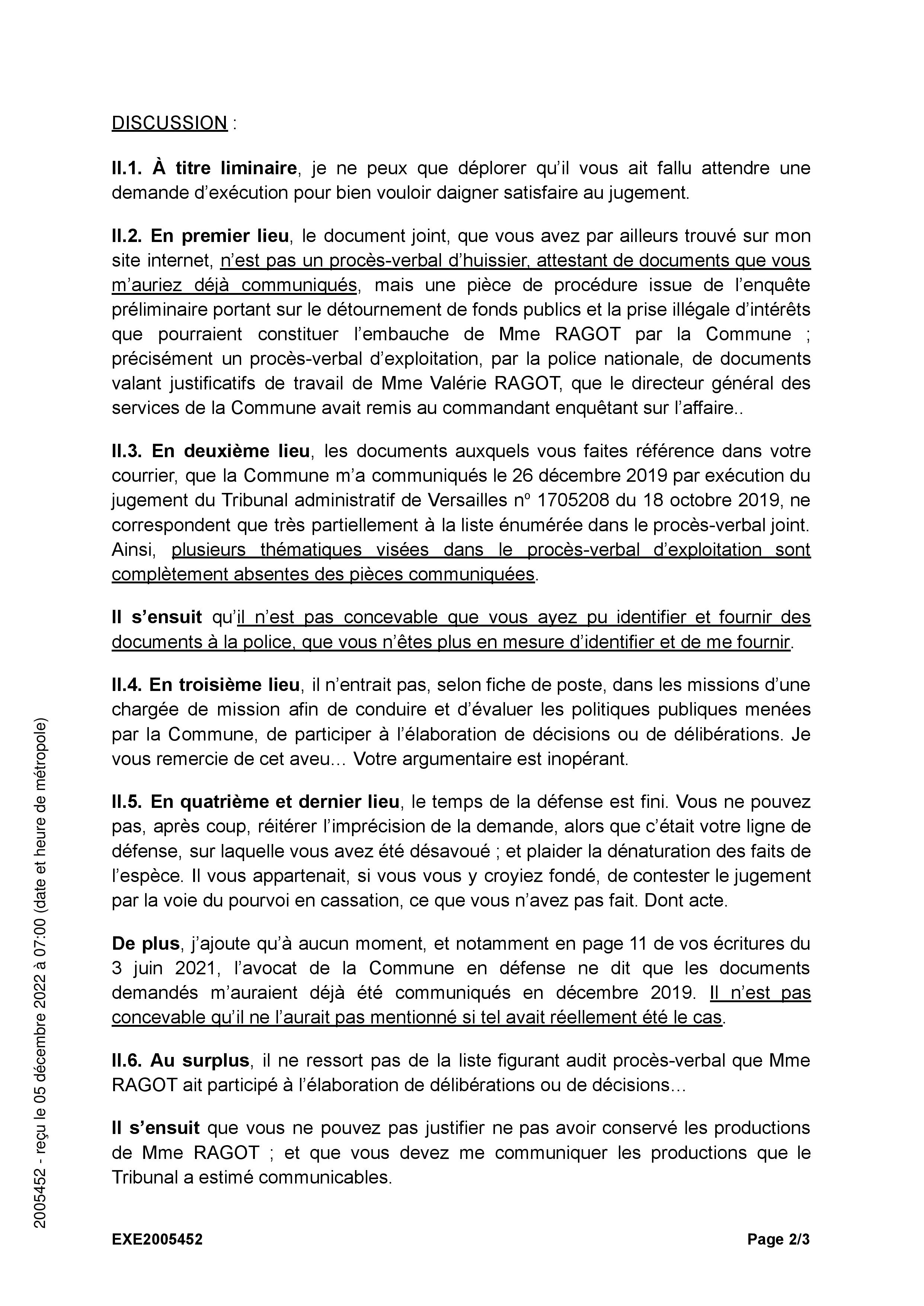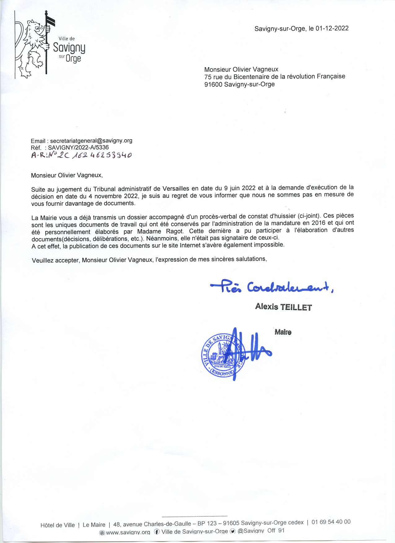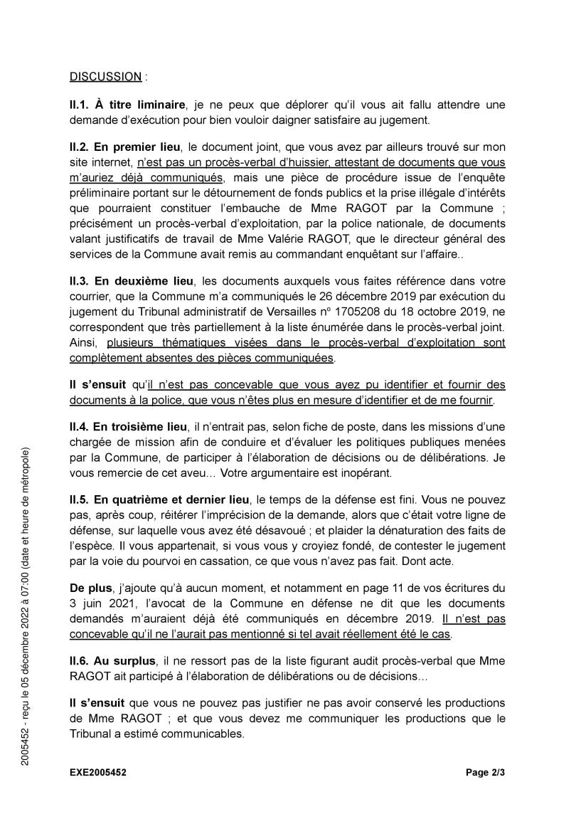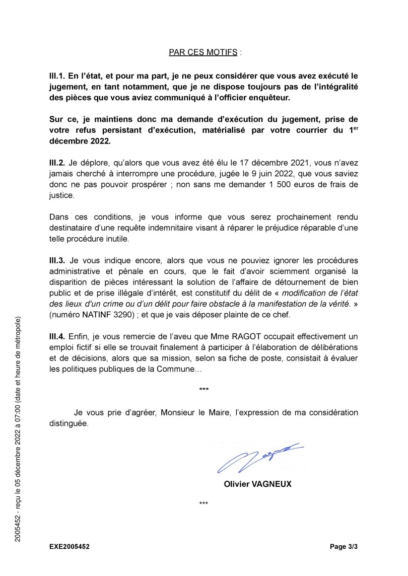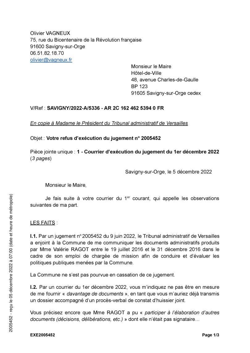 Ce 1er décembre 2022, la Commune de Savigny-sur-Orge a « essayé », j’écris bien essayé, d’exécuter un jugement ; uniquement parce que j’ai saisi le Tribunal pour forcer la Ville à accomplir sa condamnation. Sinon TEILLET continuait de faire le mort…