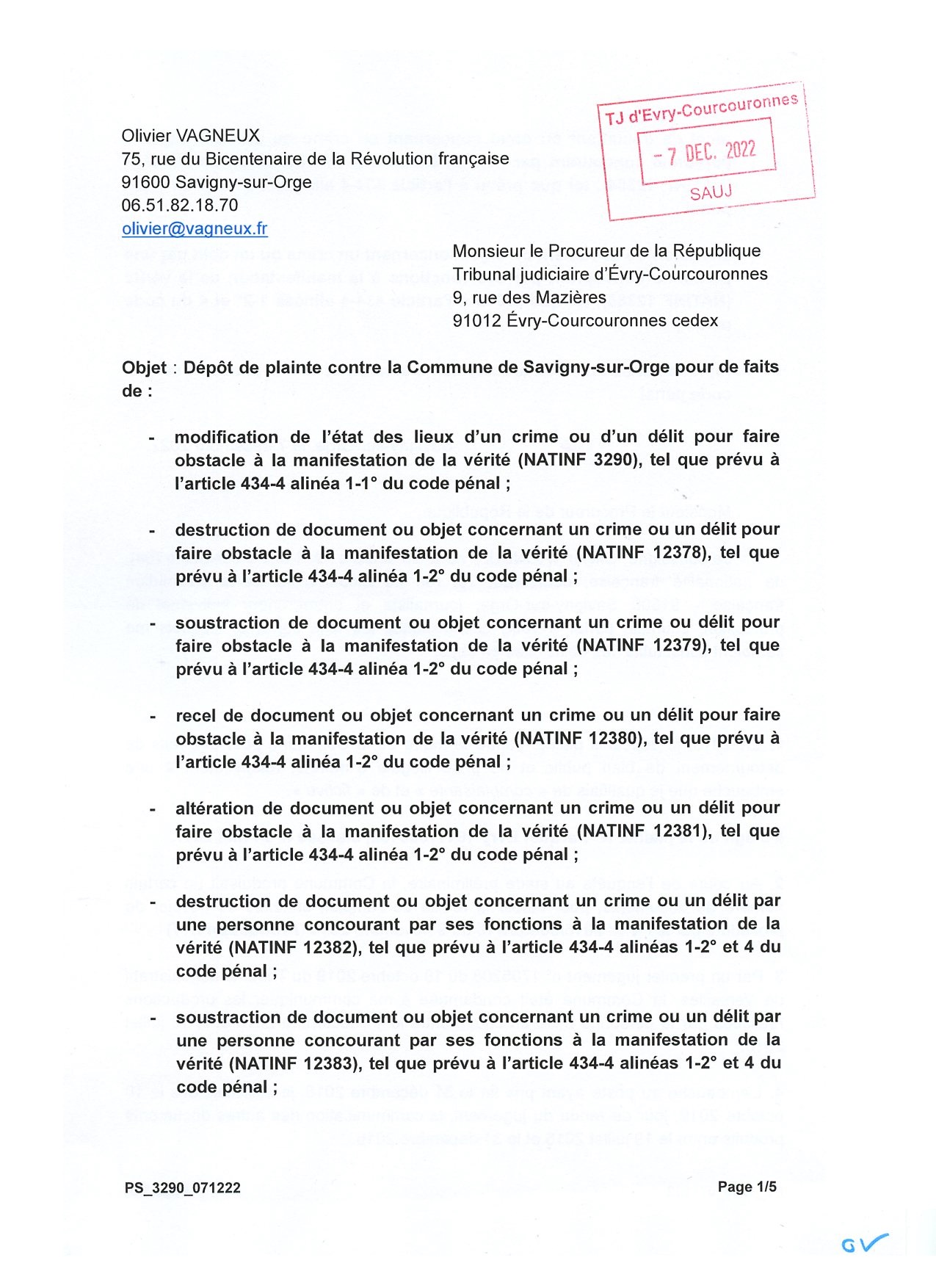 C’était pendant que je me trouvais au Tribunal pour déposer ma plainte contre la Commune pour destruction ou soustraction de documents concernant un délit par une personne concourant par ses fonctions à la manifestation de la vérité, rapport à TEILLET qui ne peut plus exécuter le jugement mais qui a bien fermé sa gueule pendant toute l’instruction pour ne pas dire qu’il n’y avait donc rien à juger.