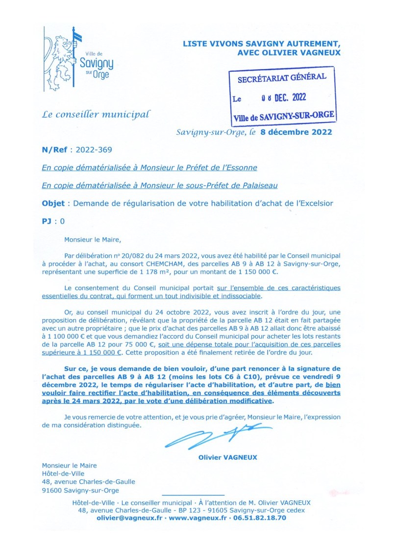 Dans un dernier effort pour régulariser l’achat de l’Excelsior, j’ai saisi le préfet de l’Essonne et le sous-préfet de Palaiseau. J’ai toute confiance en eux pour qu’ils ne fassent ABSOLUMENT RIEN.