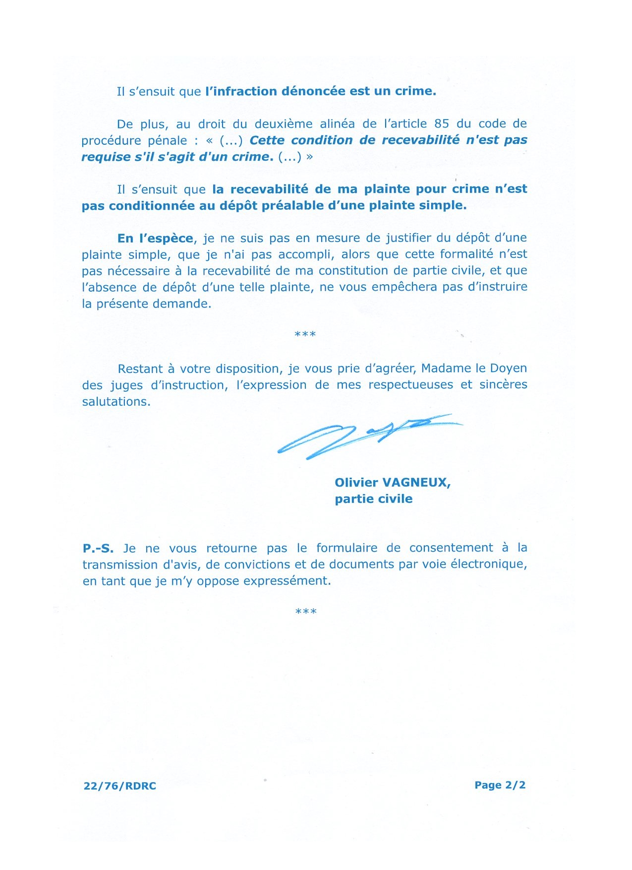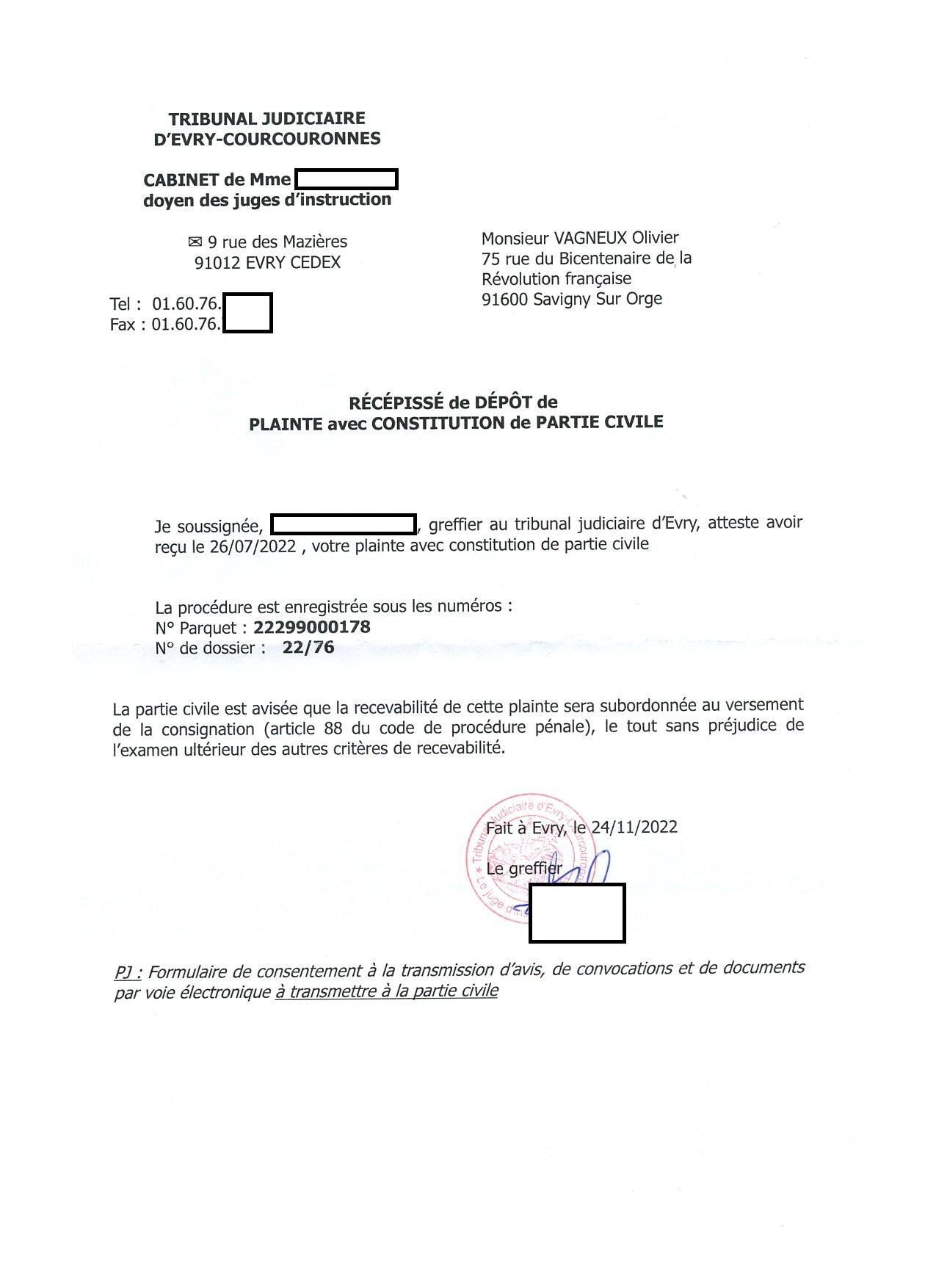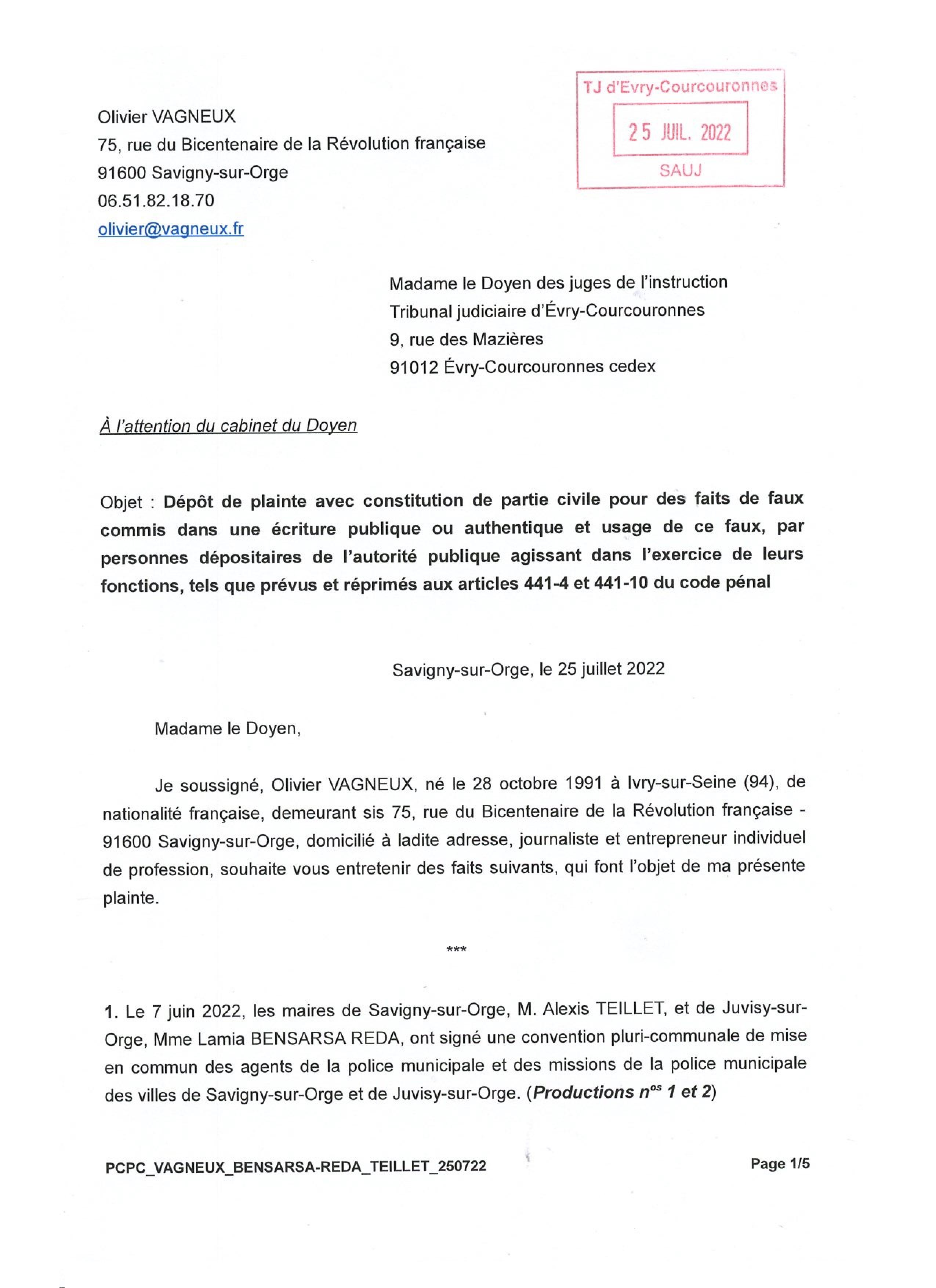 J’ai sinon reçu le récépissé de ma première plainte avec constitution de partie civile pour faux contre TEILLET (et contre Lamia REDA).