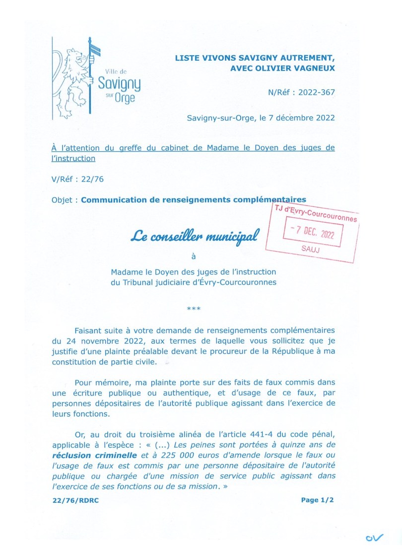 La nouvelle doyenne des juges de l’instruction d’Évry-Courcouronnes semble ignorer que le faux en écriture commis par un maire est un crime (article 441-4 al.3 du code pénal), et que le crime est une infraction dont la dénonciation par plainte avec constitution de partie civile est dispensée du dépôt d’une plainte préalable (article 85 alinéa 2 du code de procédure pénale).