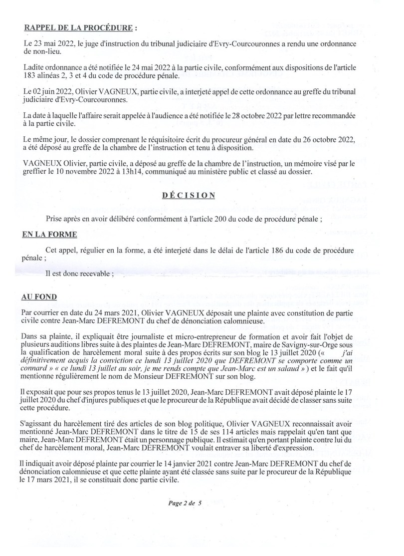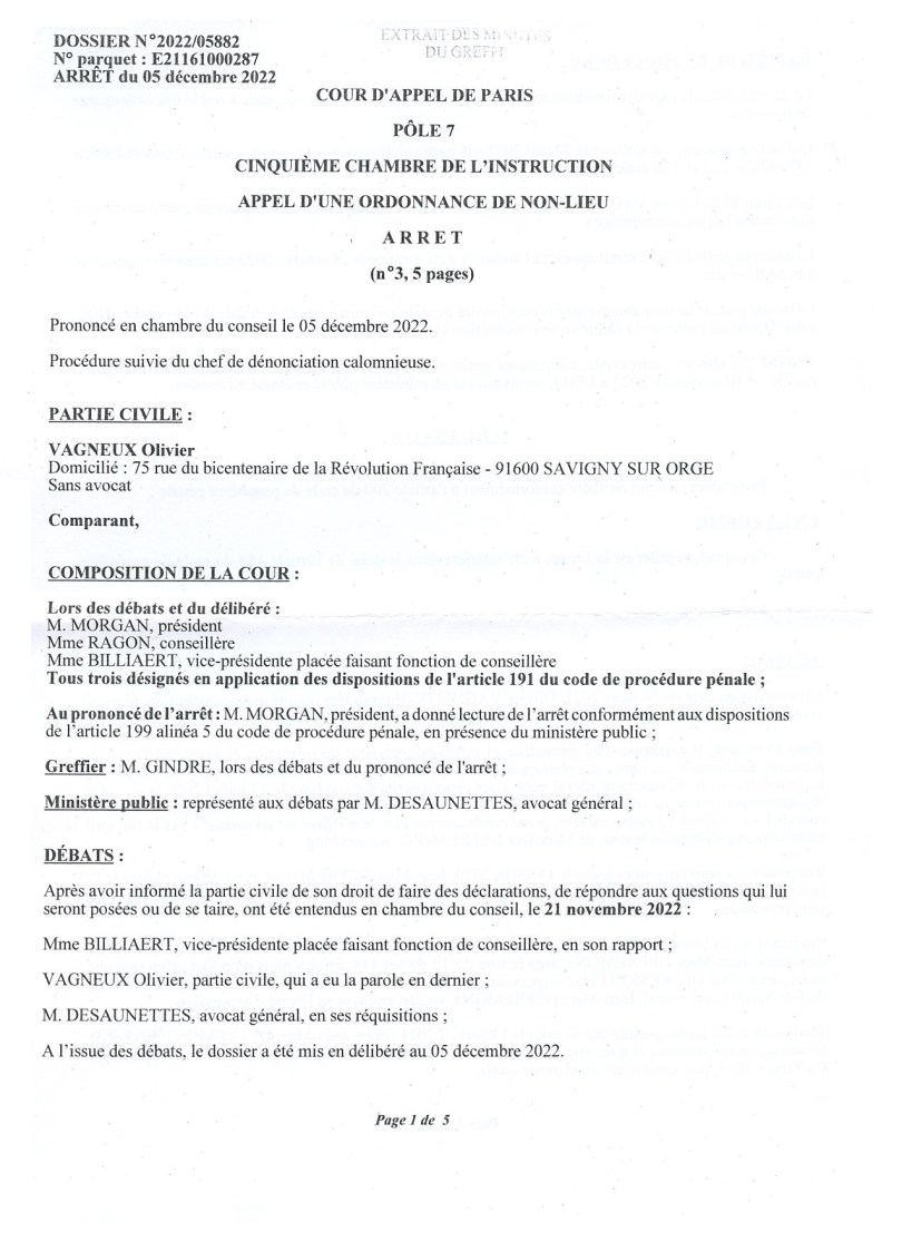 Dénonciation calomnieuse d’Olivier VAGNEUX par Jean-Marc DEFRÉMONT : la Cour d’appel de Paris casse l’ordonnance de non-lieu et annule l’amende civile de 600 euros à laquelle avait été condamnée O. VAGNEUX