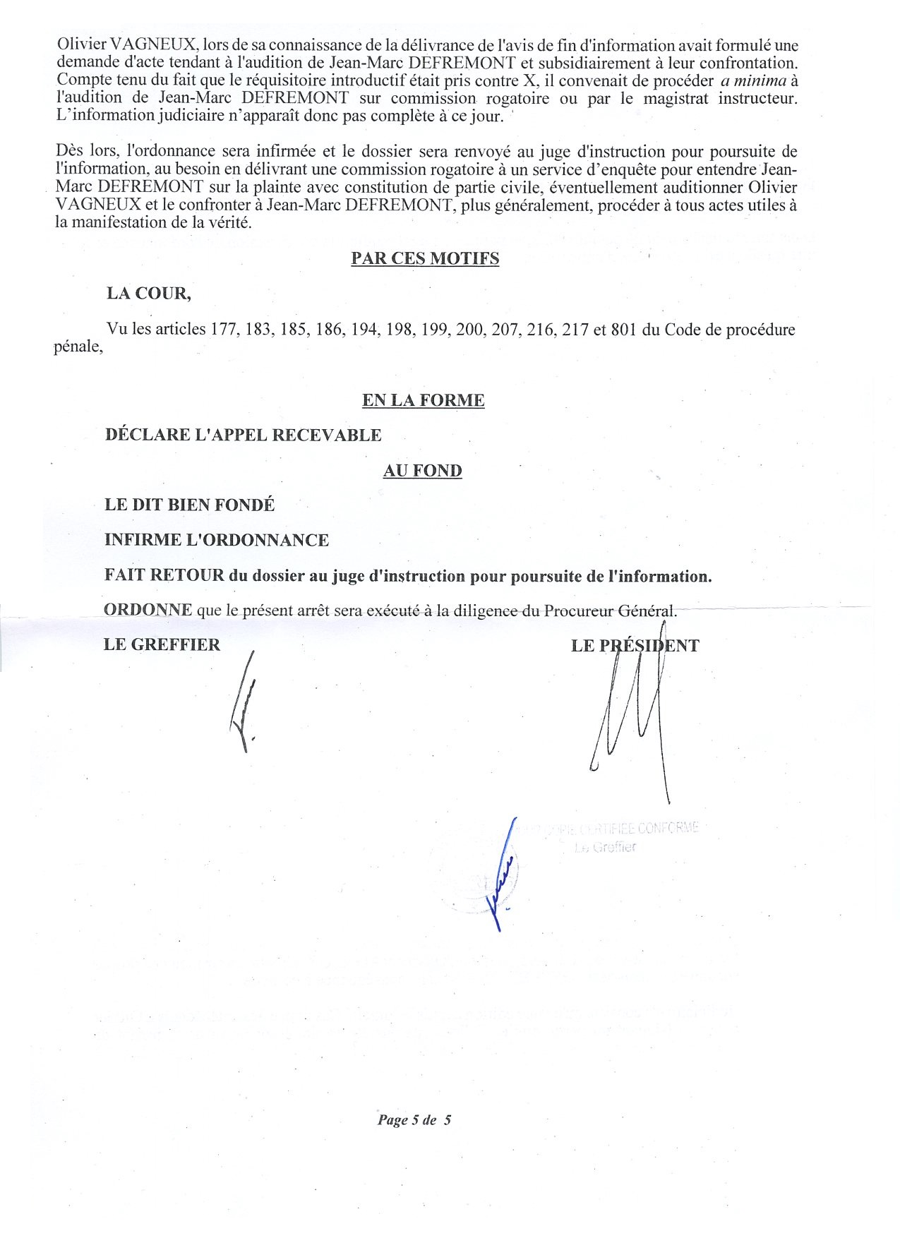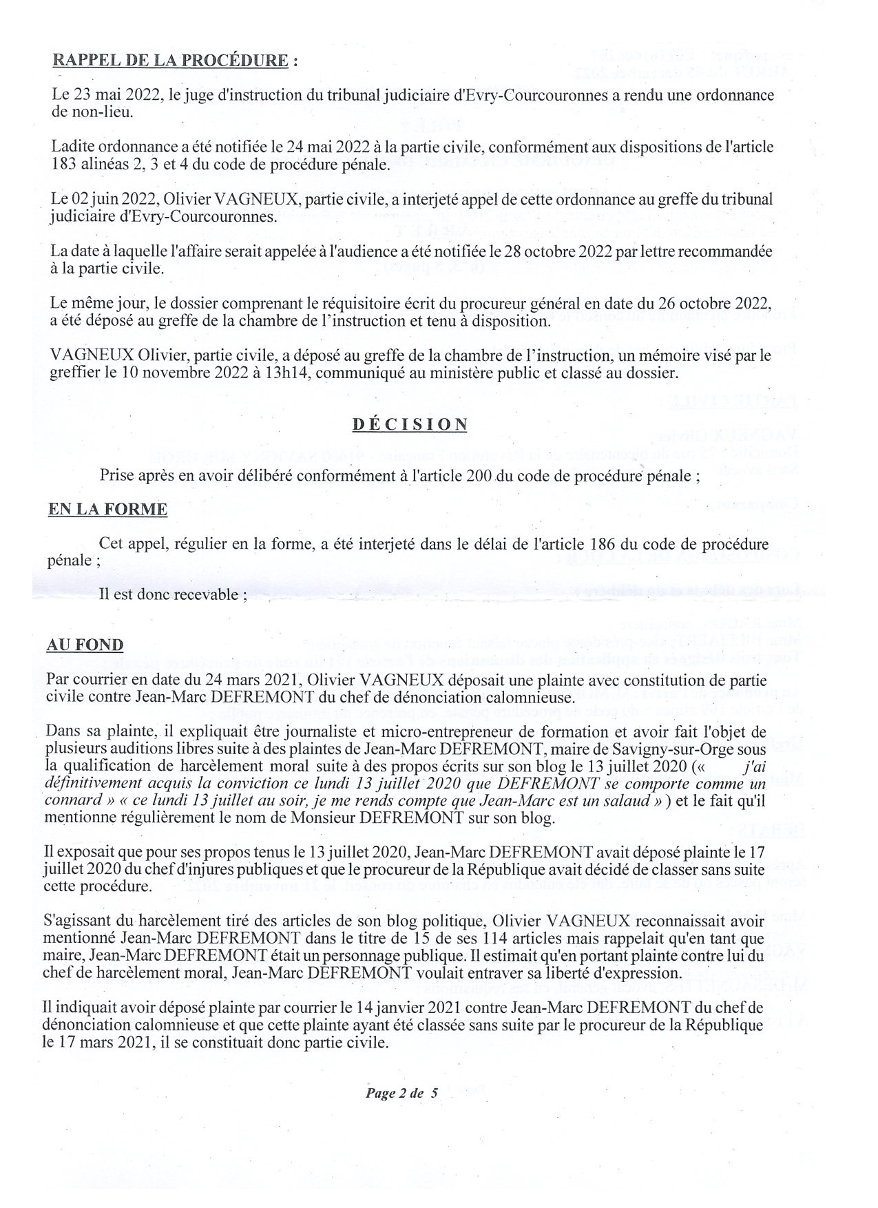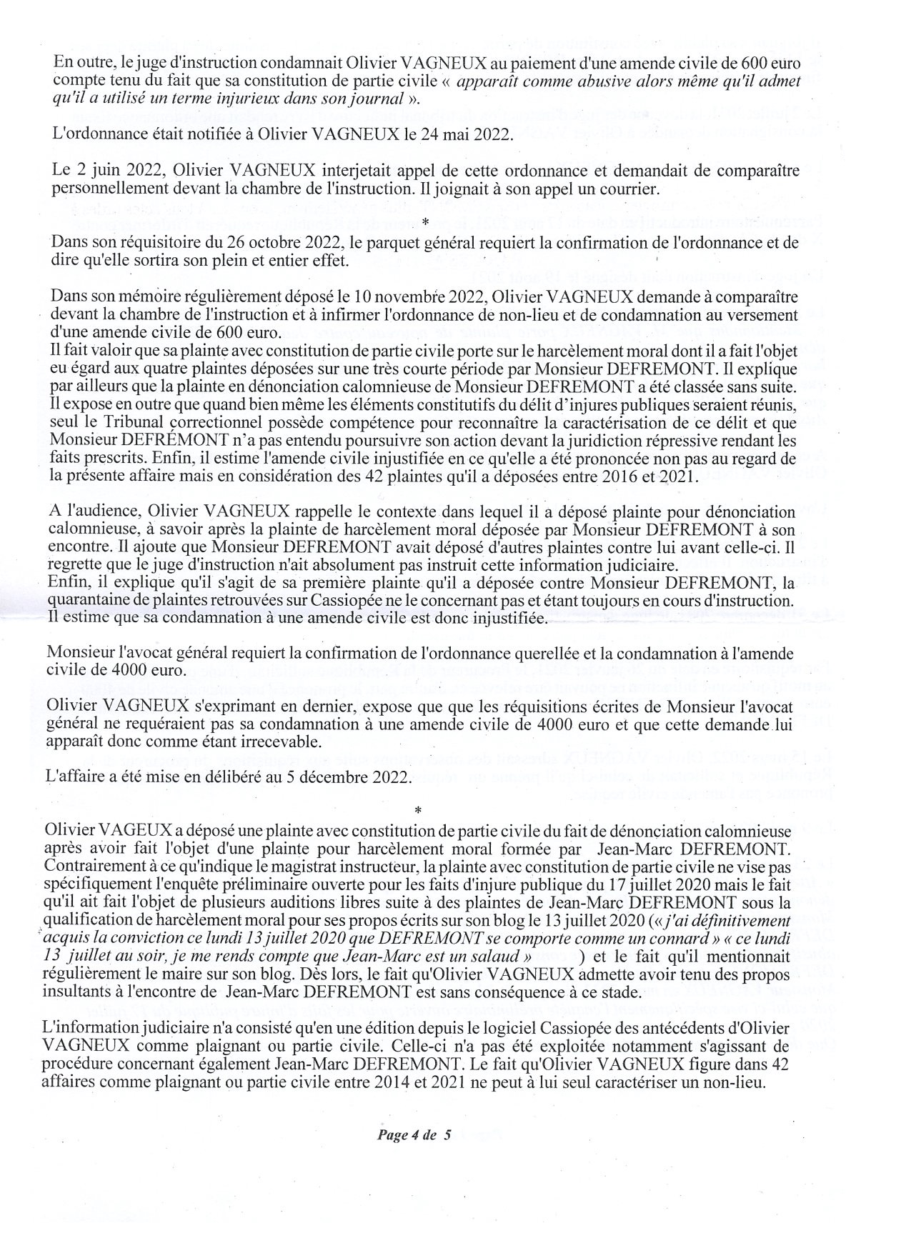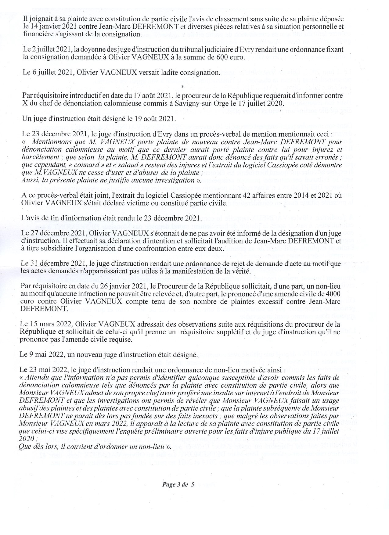 Dénonciation calomnieuse d’Olivier VAGNEUX par Jean-Marc DEFRÉMONT : la Cour d’appel de Paris casse l’ordonnance de non-lieu et annule l’amende civile de 600 euros à laquelle avait été condamnée O. VAGNEUX