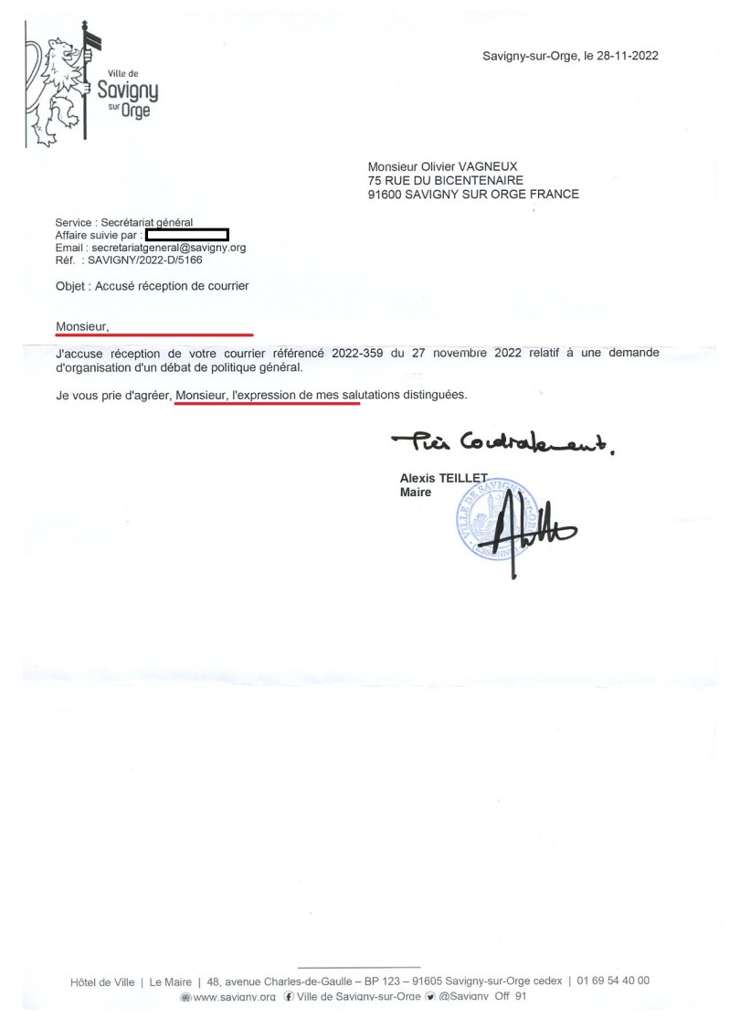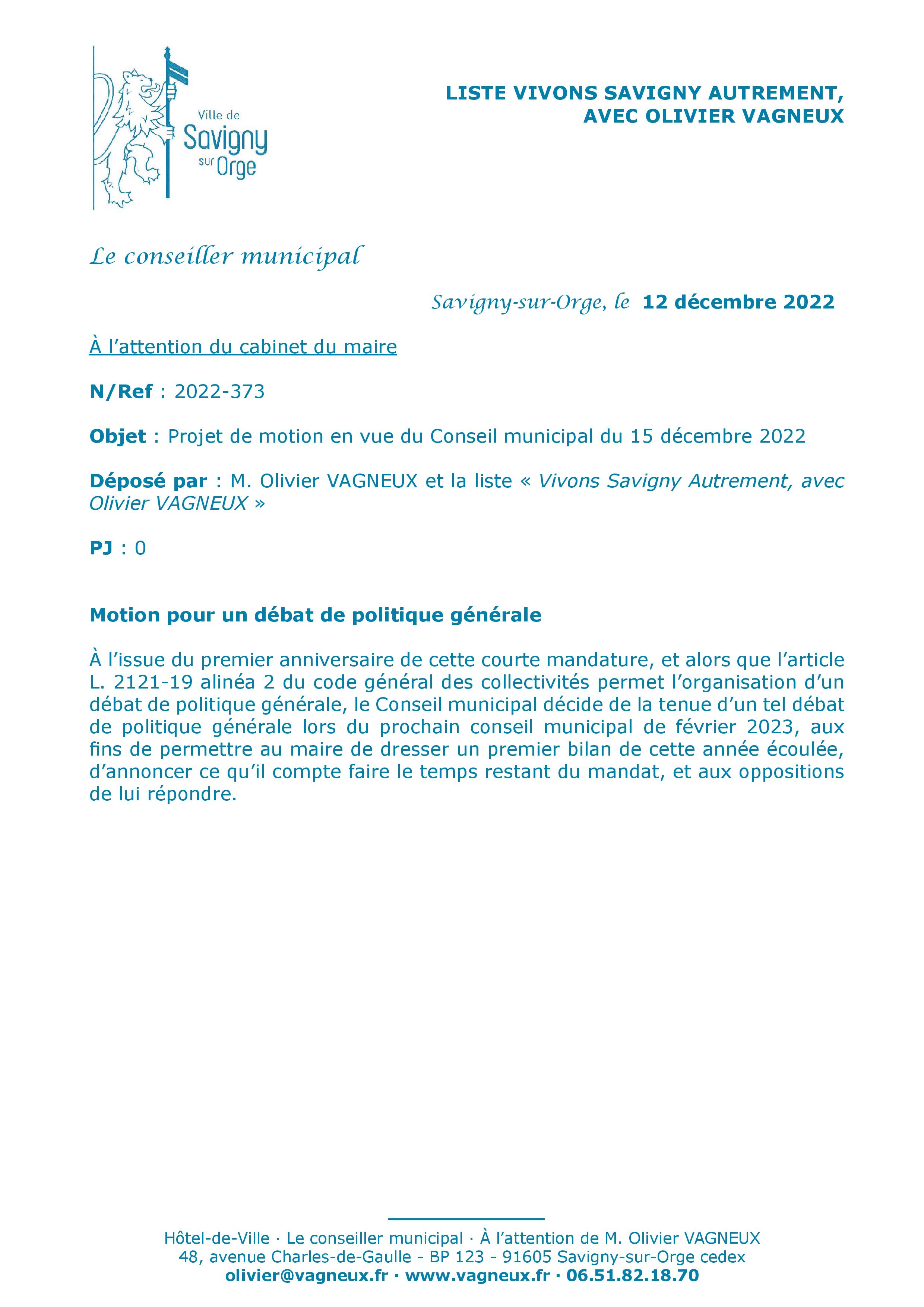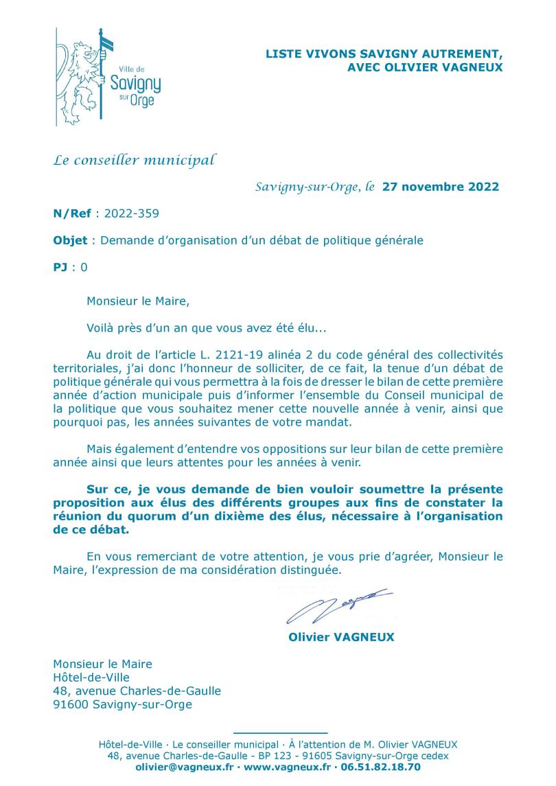 Pour l’anniversaire du mandat d’Alexis TEILLET, Olivier VAGNEUX a demandé l’organisation d’un débat de politique générale