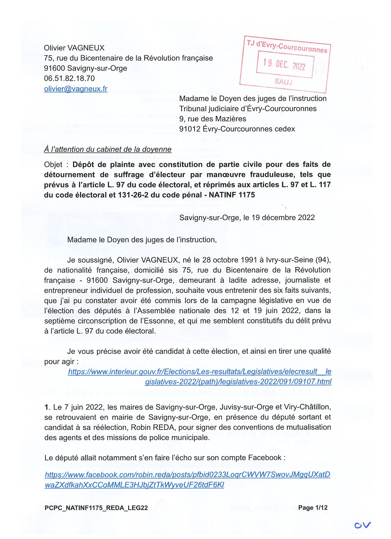 Comme vous le savez tous, la prescription de la très grande majorité des fraudes électorales est atteinte six mois jour pour jour après la proclamation des résultats. Je devais donc agir d’ici au 20 décembre 2022 pour espérer quelque chose. Si REDA, pour sa part, est tranquille, du fait de son immunité ; les autres (BENSARSA, TEILLET, VILAIN, BÉNÉTEAU), non !