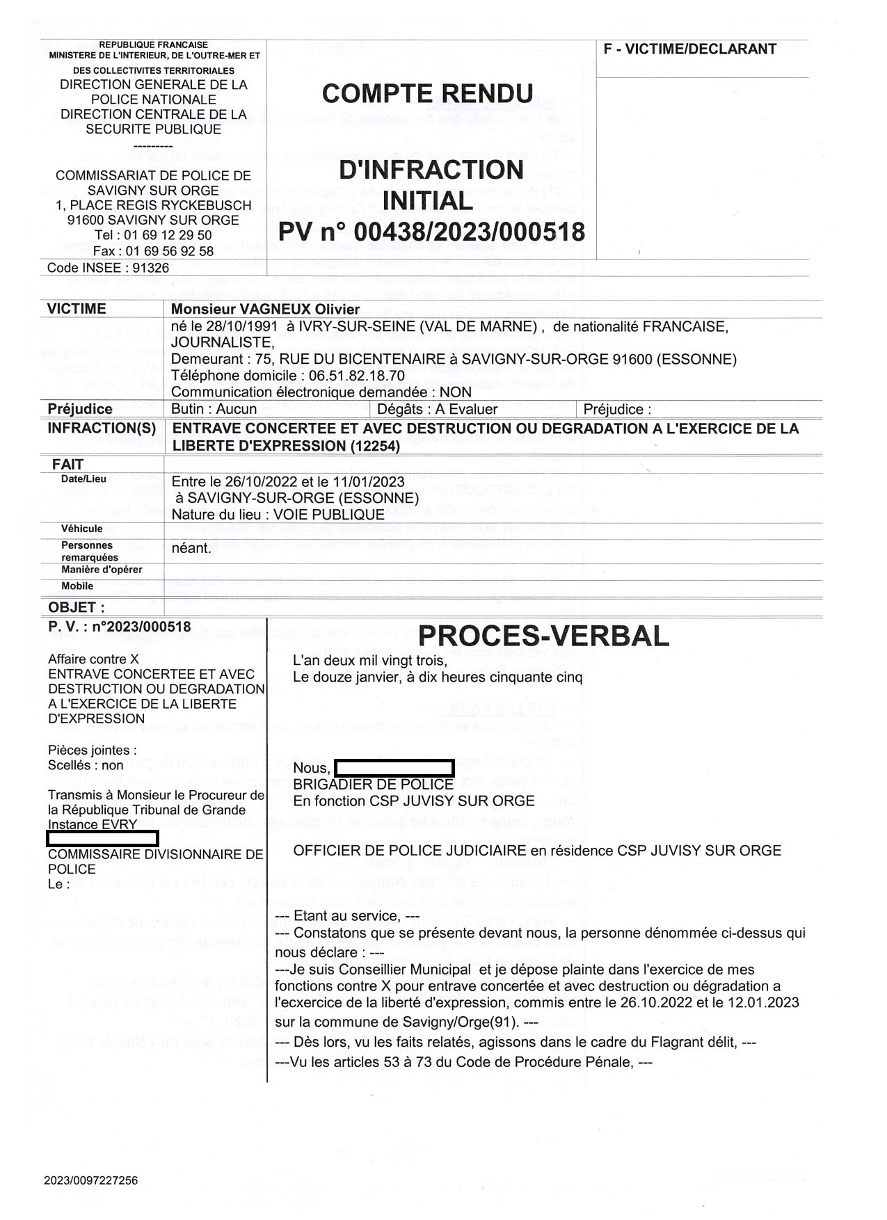 J’ai déposé plainte ; en qualité de conseiller municipal, sur conseil de l’officier de police judiciaire.