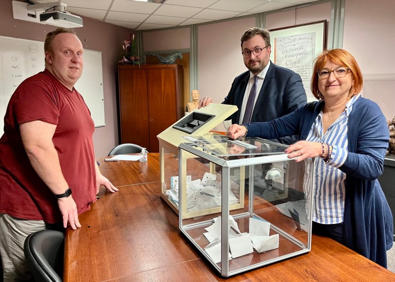 À quel moment tu tiens les urnes de la sorte, après avoir manifestement terminé le dépouillement, et à quoi correspondent les bulletins restants dans la deuxième urne ?