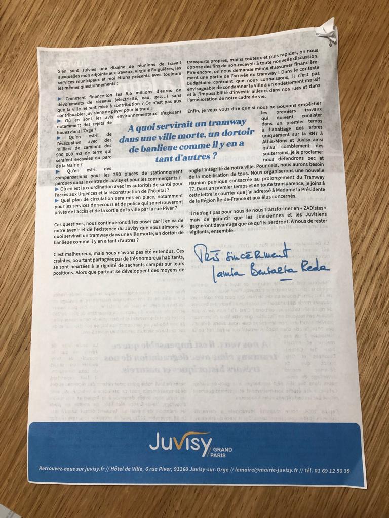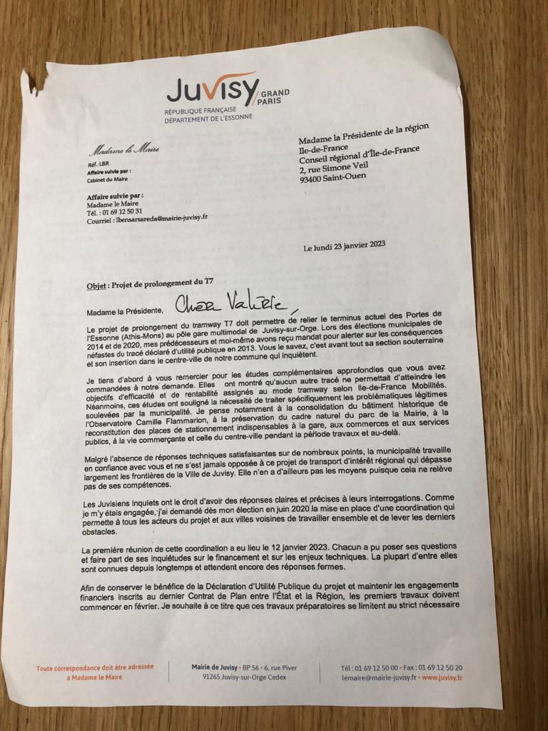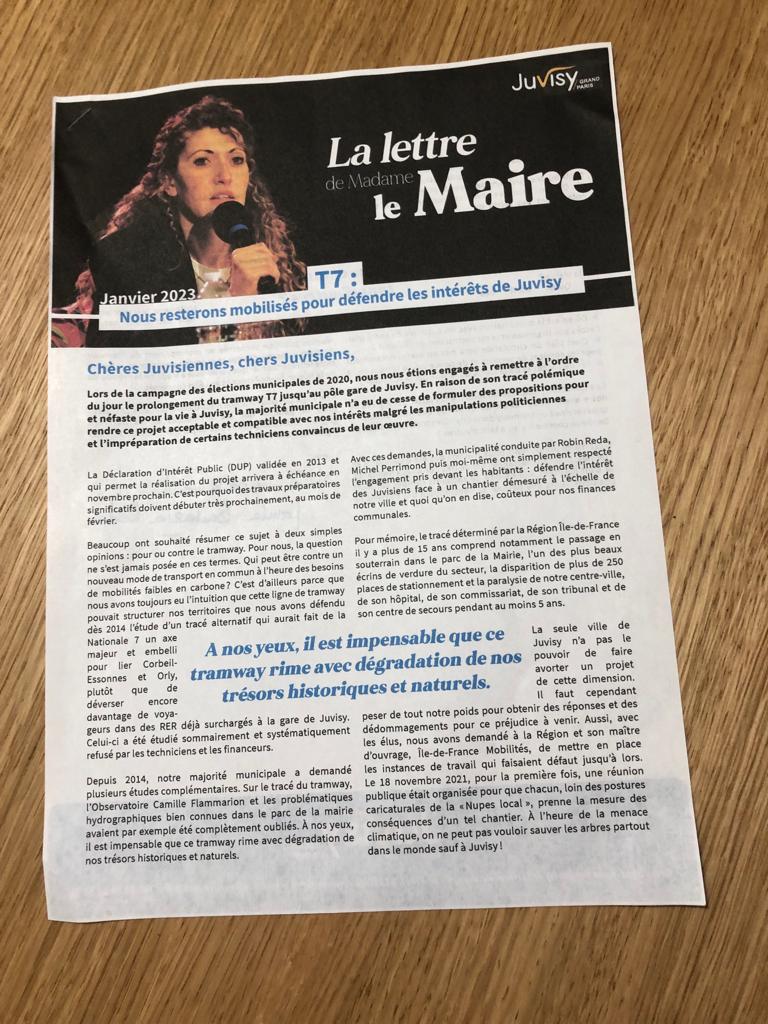 Pour archives ; le nouveau point de vue des REDA BENSARSA sur le T7 en janvier 2023 : ils ont toujours favorisé le projet d’extension du T7 (qui a été arrêté en 2013 et qui prévoit d’aller à la gare de Juvisy en passant par le parc de la mairie), mais en fait à la condition qu’il n’aille pas à la gare et qu’il continue le long de la N7 (RD7) vers Corbeil. Qu’ont-ils donc soutenu sinon une idée ou un principe ?