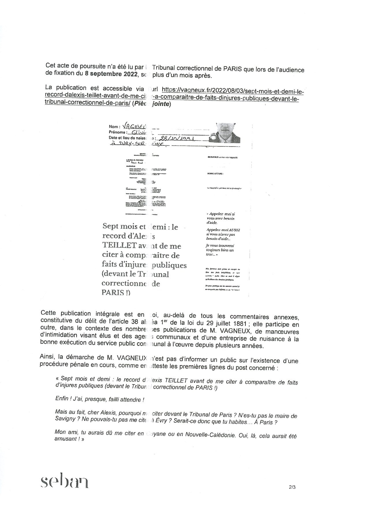 - à l’audience, quand il a dit que TEILLET ne m’avait pas cité à comparaître en tant que maire ;