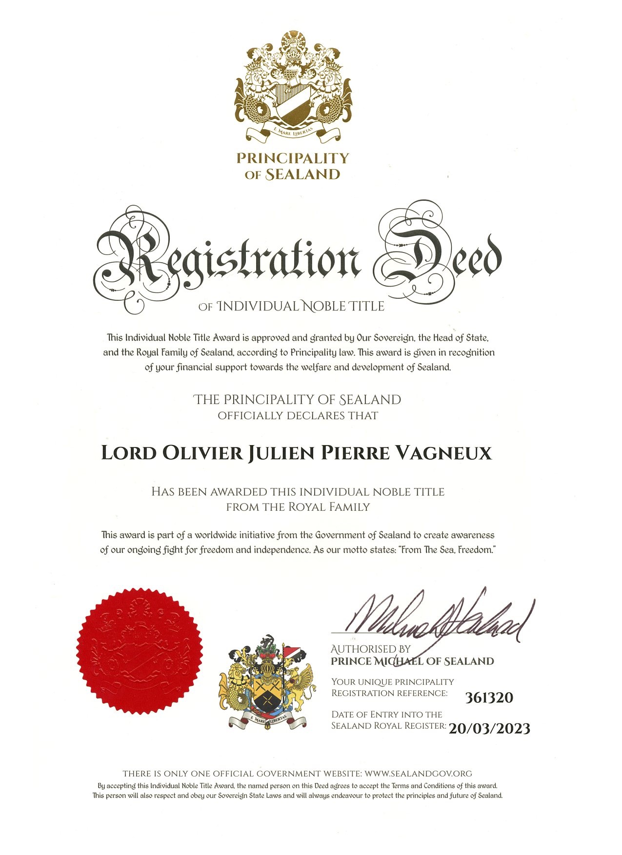 Et ceci n’est pas une blague de 1er avril puisque j’ai vraiment le titre de noblesse (et le titre de propriété d’une parcelle de territoire, l’exemplaire de la Constitution et le passeport) !