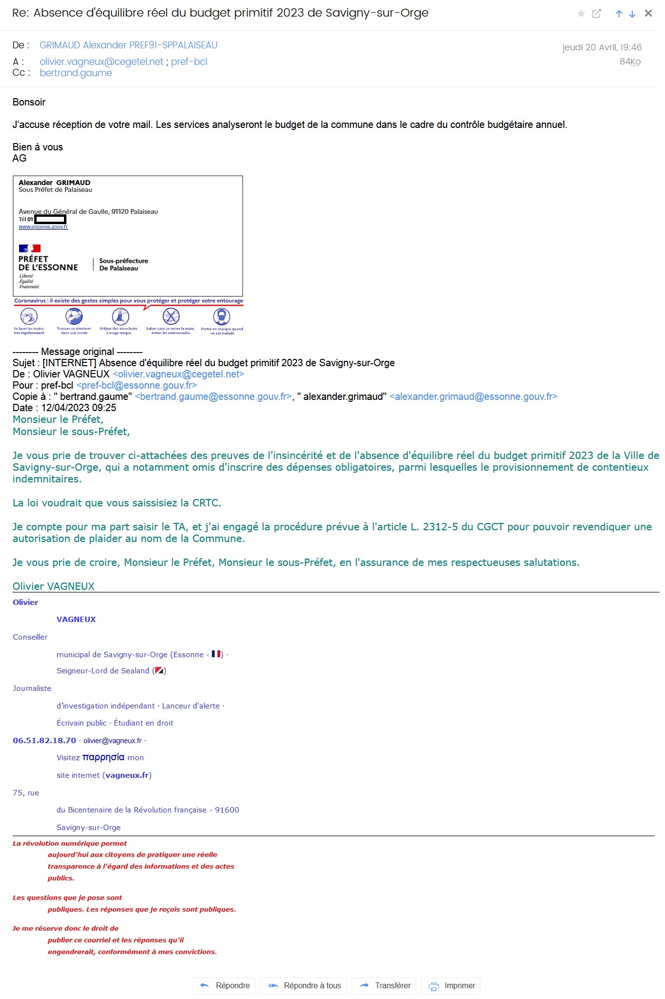 je veux interprêter cet accusé de réception (cliquez dessus pour l’agrandir), avec préfet en copie, comme un sérieux avertissement pour Alexis TEILLET ; comme si le sous-préfet s’était senti obligé de m’écrire, pour la première fois du mandat, parce qu’il va devoir se résoudre à intervenir, bien malgré lui… (Je pense cependant qu’il ne va rien faire et que je vais agir !)