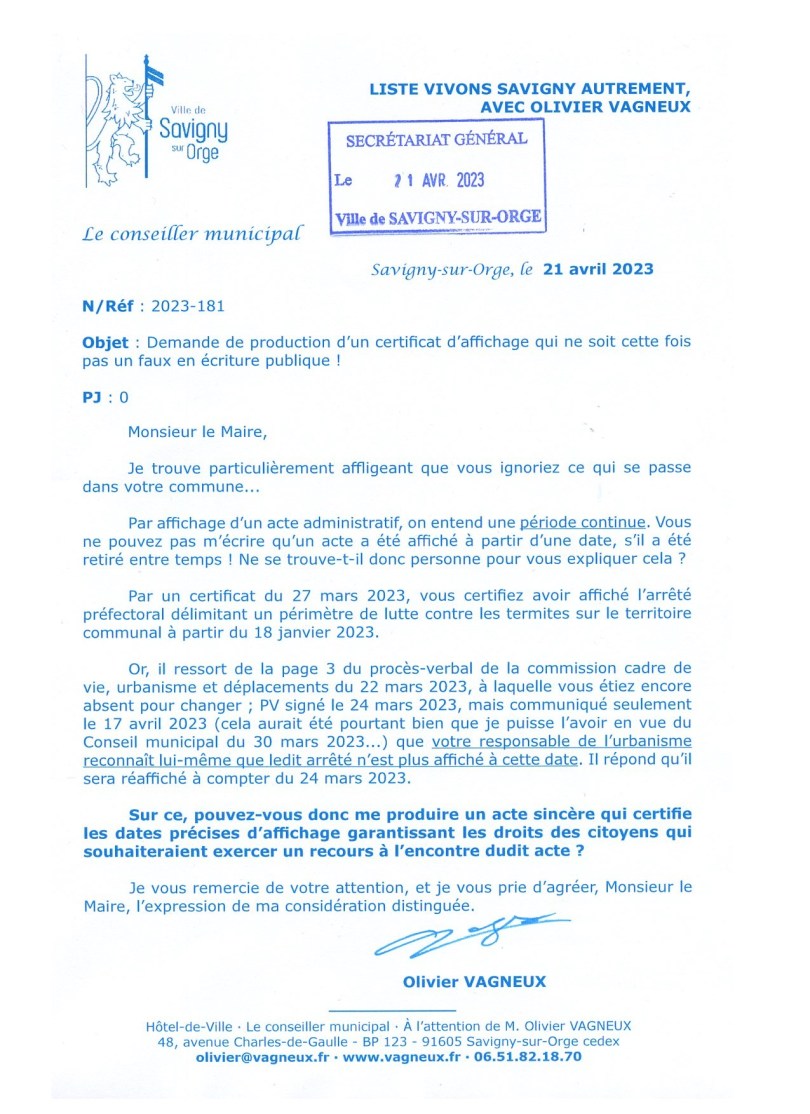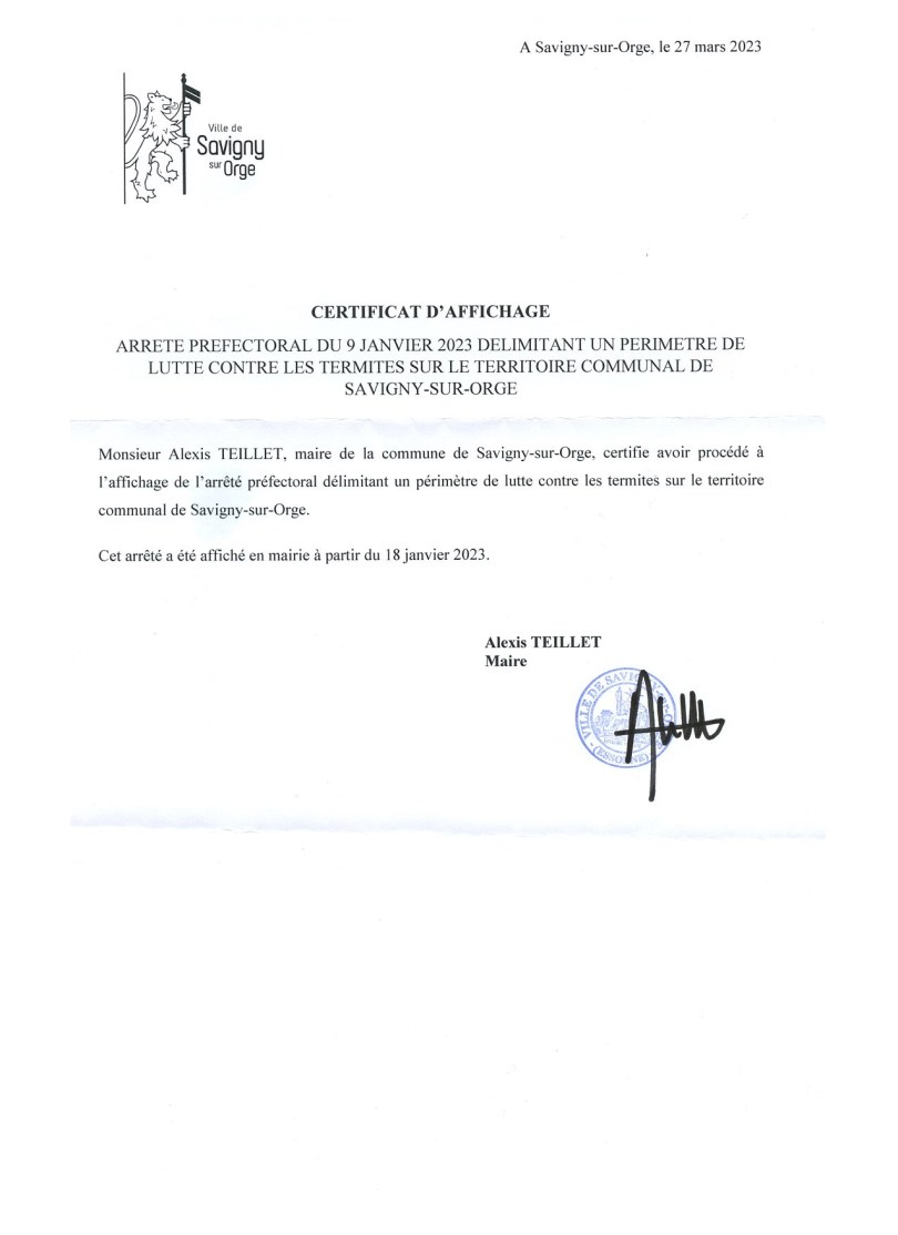 Du coup, je me fous de sa gueule, et je lui demande quand est-ce qu’il a réellement affiché l’arrêté préfectoral anti-termites, qui doit faire l’objet d’un affichage continu pendant trois mois.