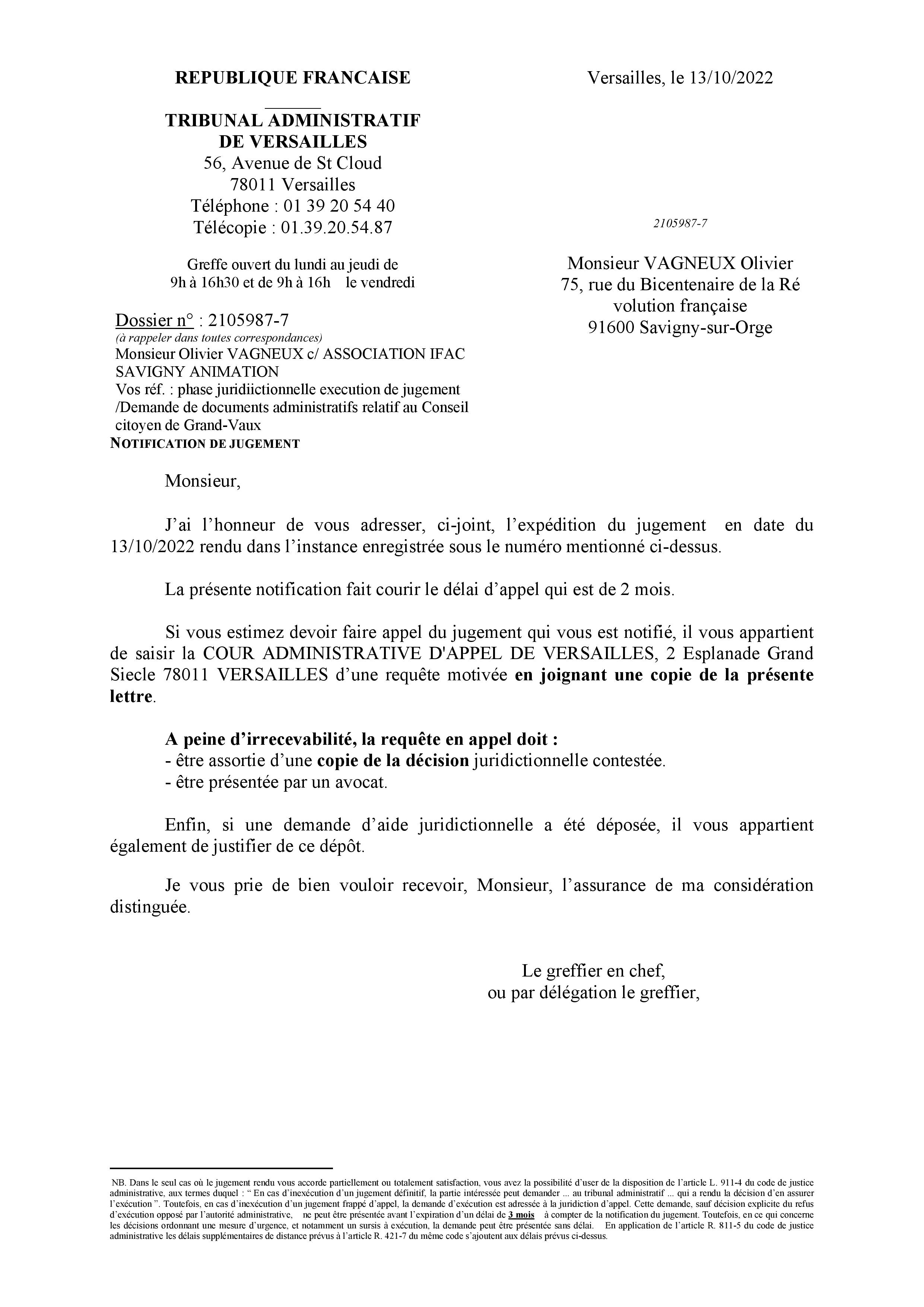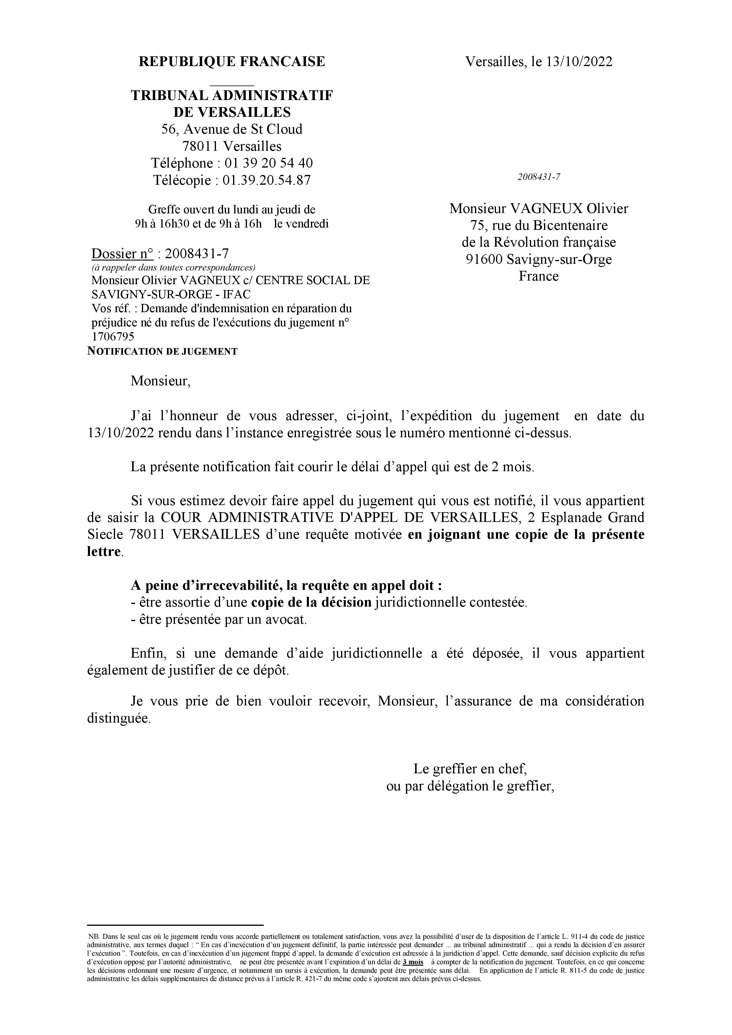 Bravo le Tribunal administratif de Versailles, qui m’écrit de faire appel, alors que je ne peux en fait que me pourvoir en cassation…