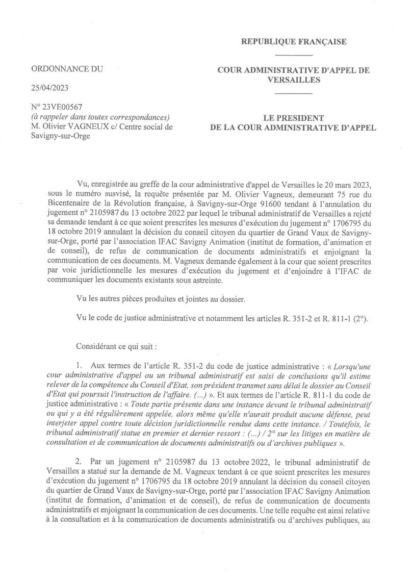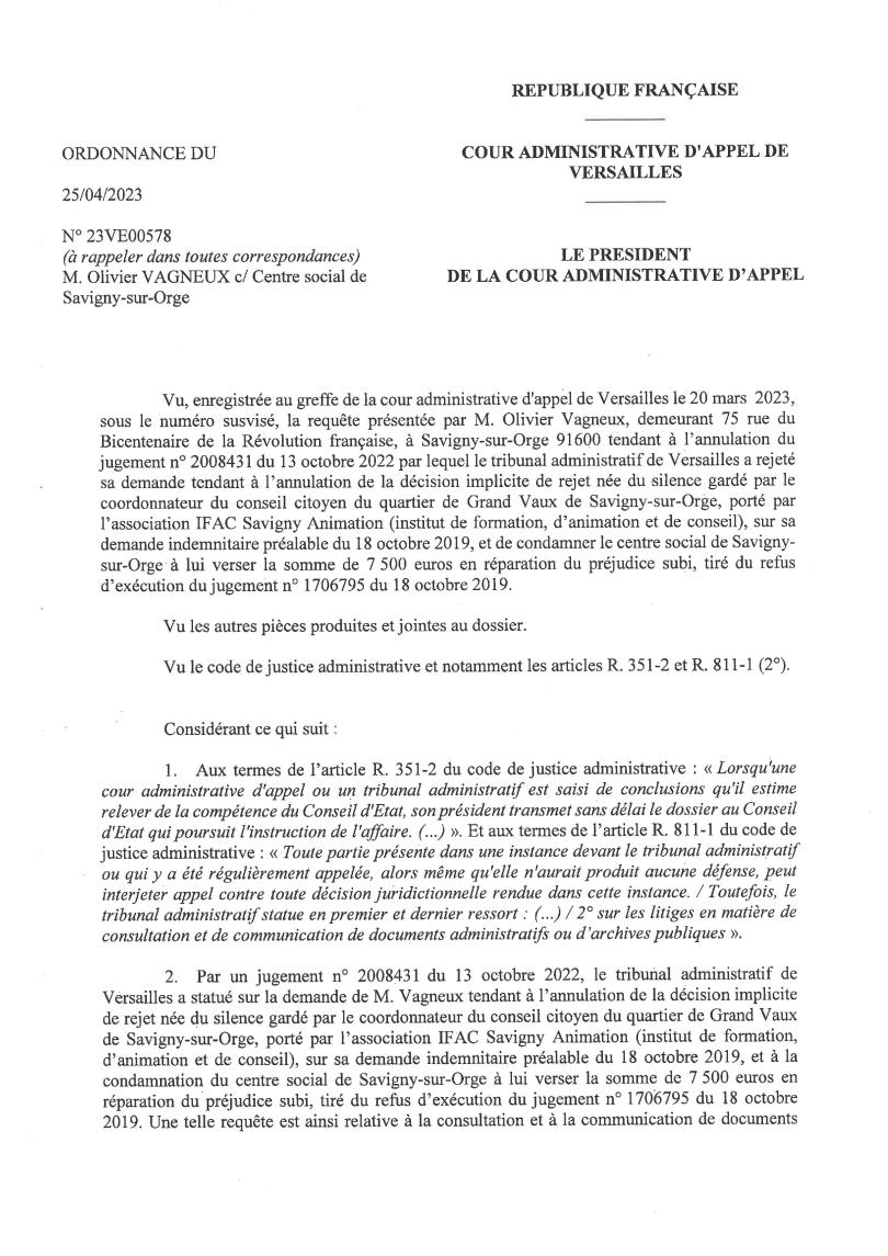 Pour mémoire, j’ai fait condamner le centre social de Savigny qui gère les maisons de quartier et le conseil citoyen de Grand-Vaux à me communiquer l’ensemble des productions du conseil citoyen de Grand-Vaux, notamment les convocations, les ordres du jour, les compte-rendus de séance, les questions, les rapports, les procès-verbaux et les avis.