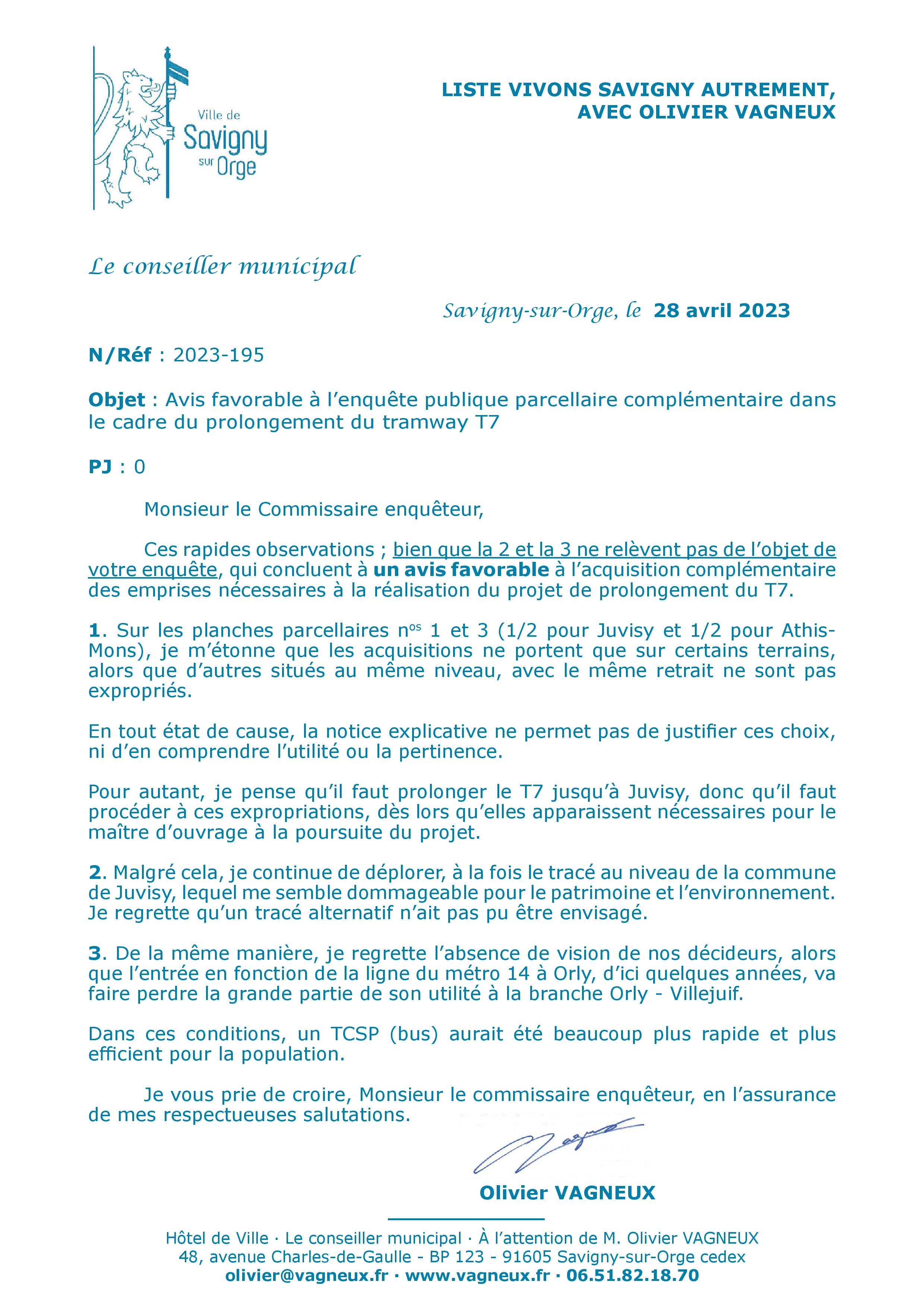 Sur ce, j’ai donc rendu un avis favorable, dans l’enquête publique parcellaire complémentaire pour le prolongement du T7, du 10 au 28 avril 2023, que j’ai voulu empli de pragmatisme.