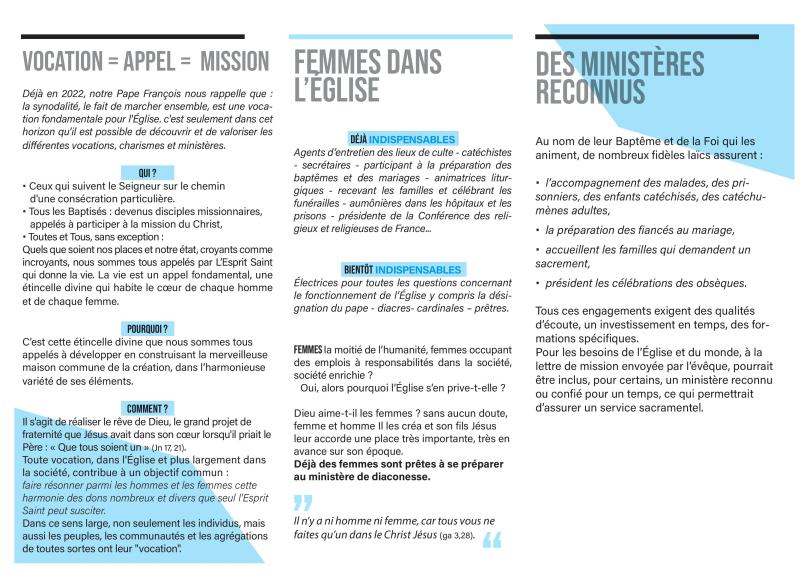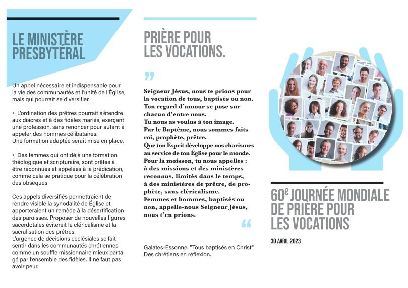 Et voilà le document réalisé par le groupe Galates-Essonne au sujet des vocations, nortamment par des chrétiens de Savigny-sur-Orge et de Chilly-Mazarin, lequel rappelle notamment que les vocations ne s’arrêtent pas au clergé. (Il faut l’imaginer plié.)