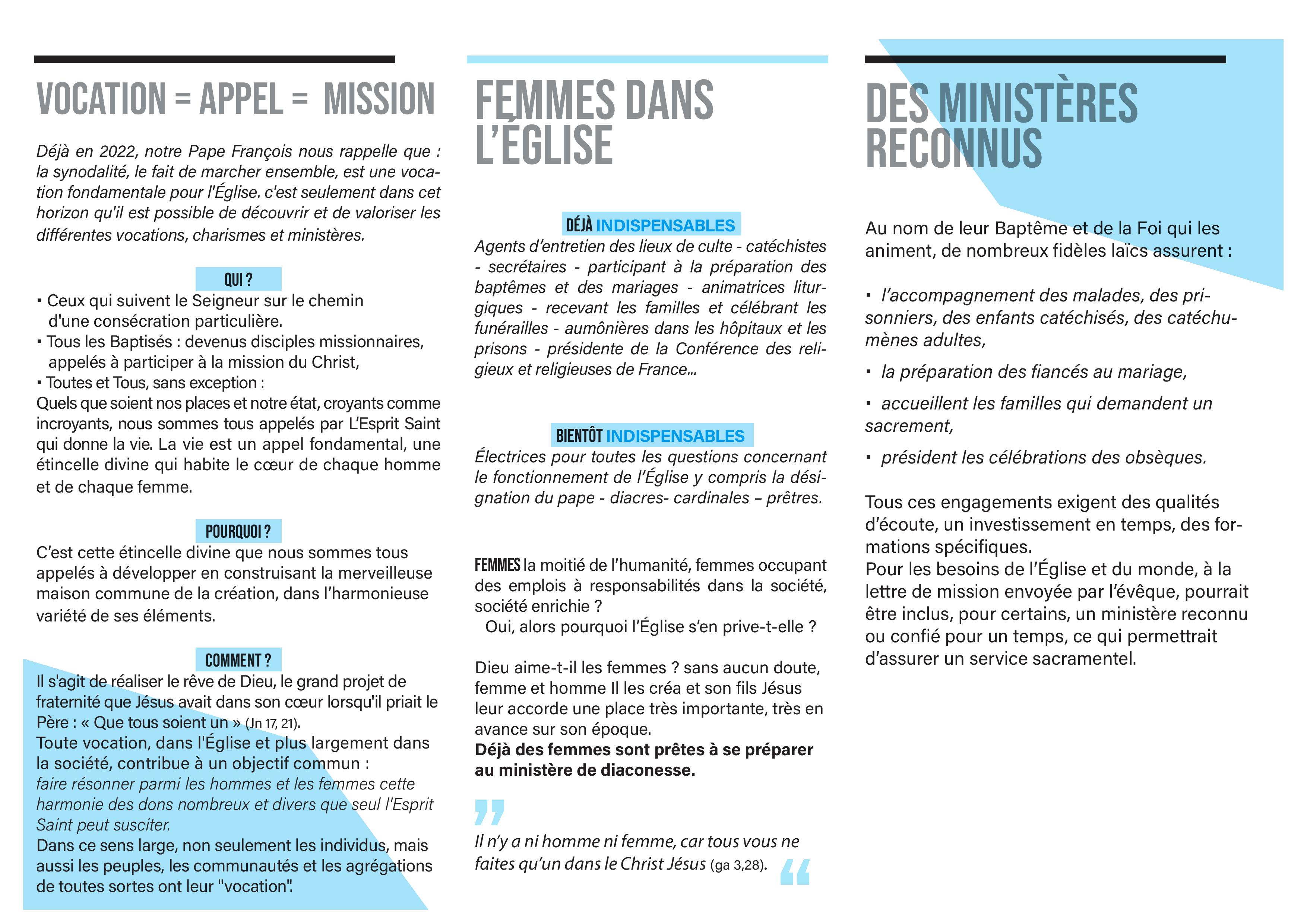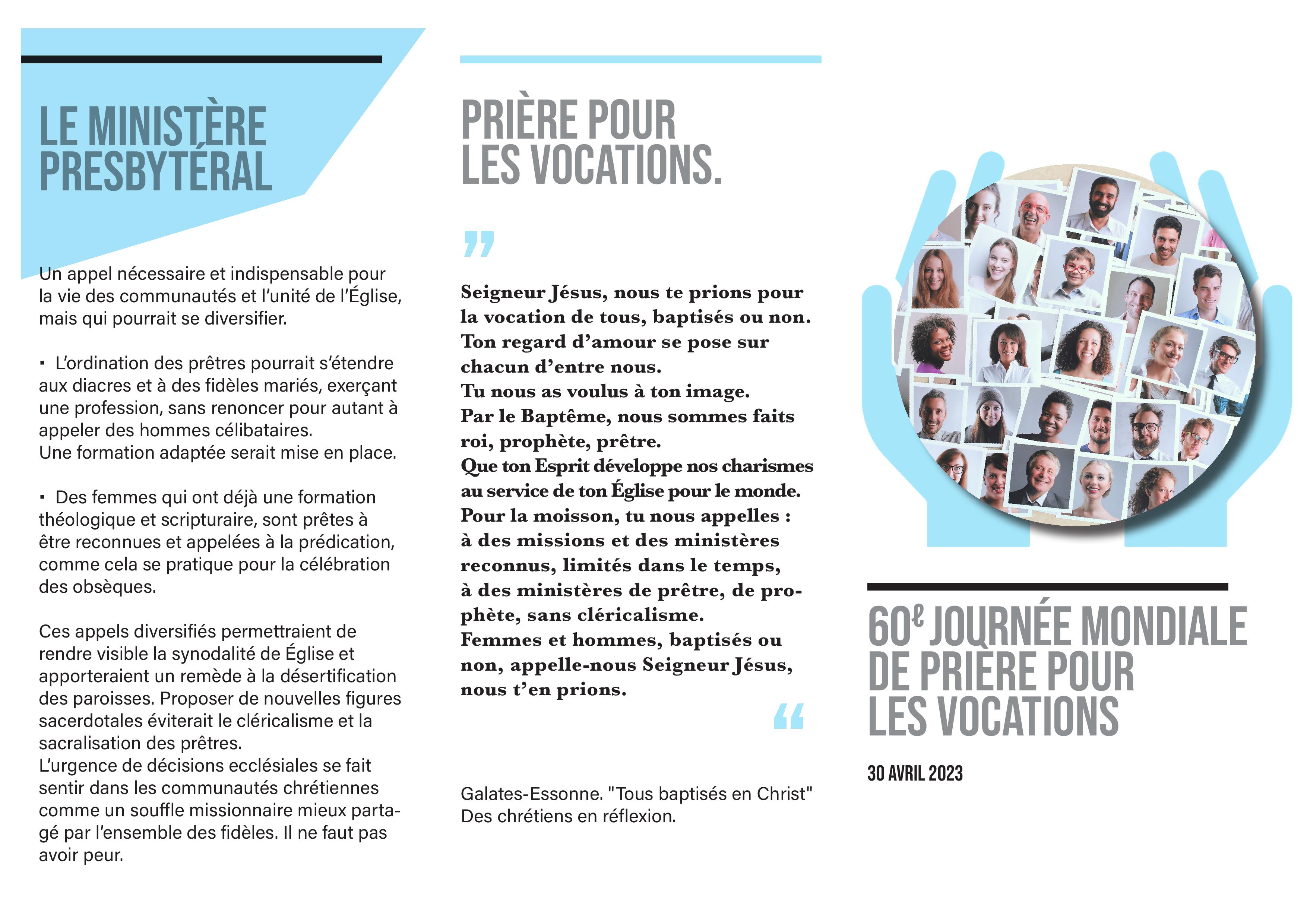 Et voilà le document réalisé par le groupe Galates-Essonne au sujet des vocations, nortamment par des chrétiens de Savigny-sur-Orge et de Chilly-Mazarin, lequel rappelle notamment que les vocations ne s’arrêtent pas au clergé. (Il faut l’imaginer plié.)