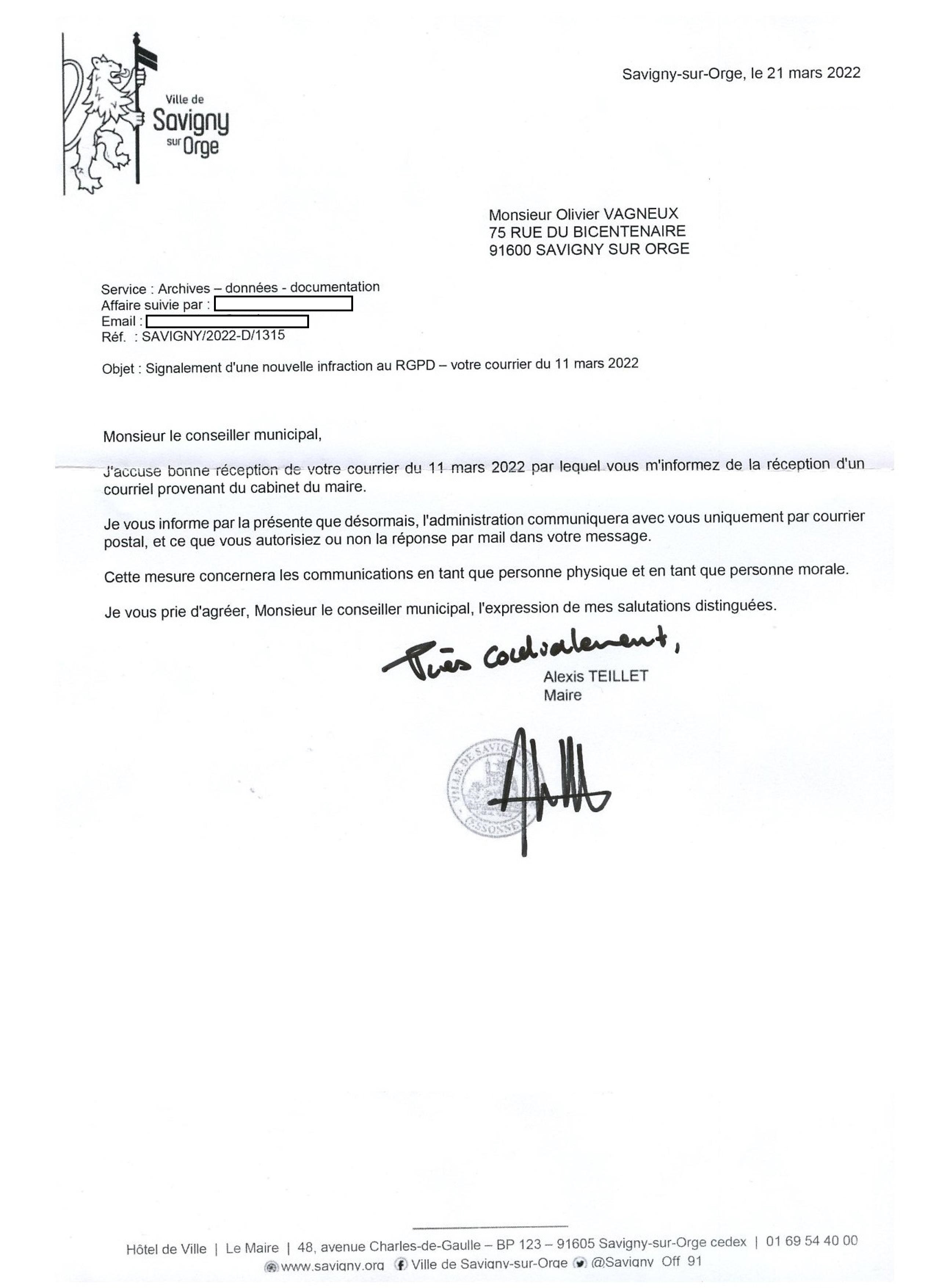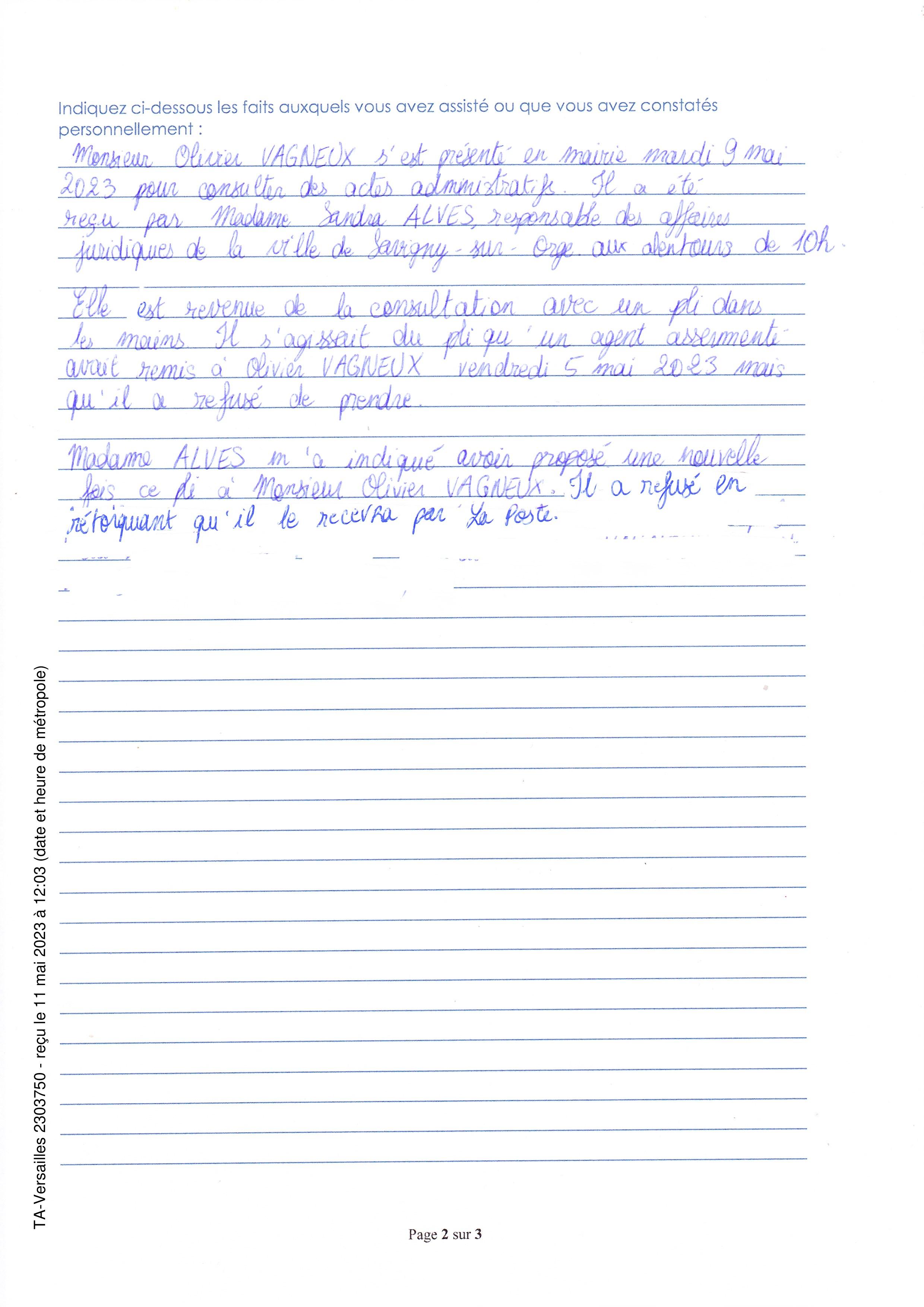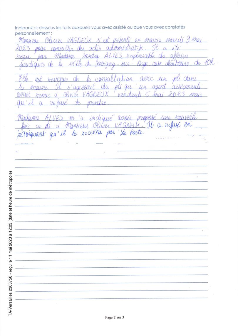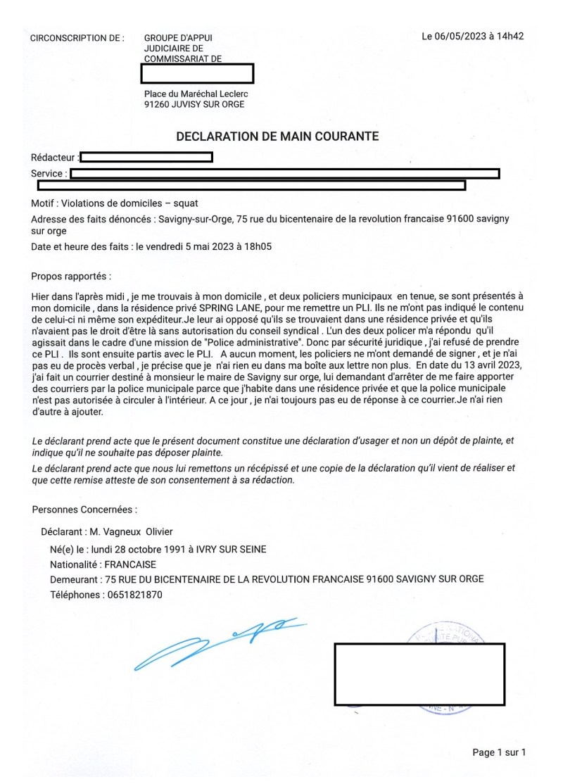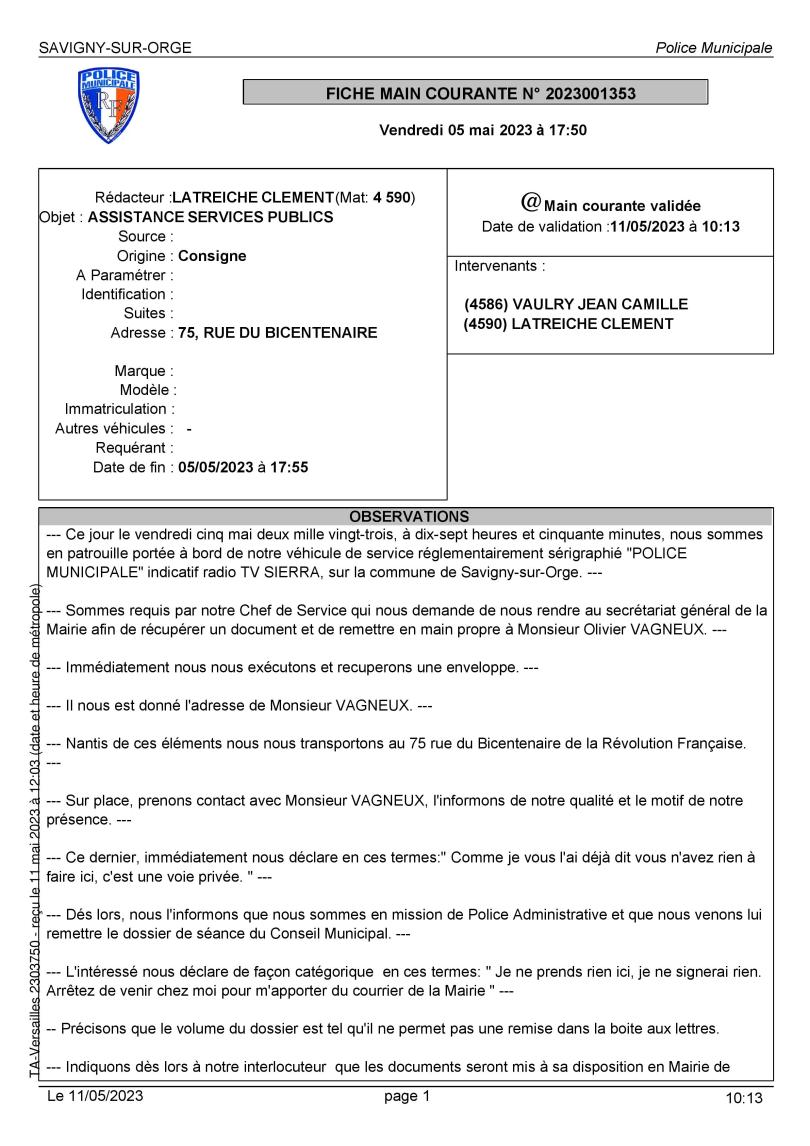 Ayant commis un référé liberté contre cette situation, que j’ai perdu (et 800 euros), j’apprends dans le mémoire en défense de la Commune, qu’ils m’auraient en fait été apportés vendredi dernier par deux policiers municipaux de Savigny-sur-Orge, Clément LATREICHE et Jean Camille VAULRY.