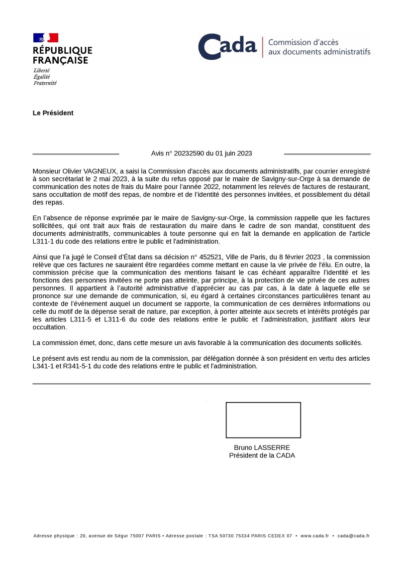 Le 31 mars 2023, je demandais au maire de Savigny-sur-Orge (Essonne) de me communiquer ses notes de frais de représentation pour 2022.