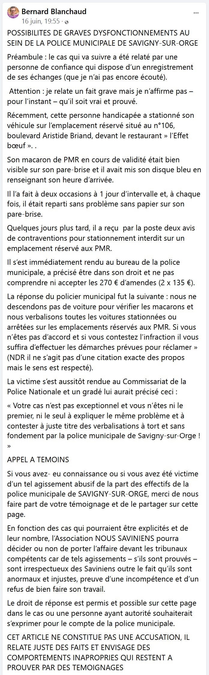 Je voudrais terminer cet article avec un appel à témoins de Bernard BLANCHAUD, dont je reprends à mon compte toutes les accusations, d’autant que j’ai entendu pire.