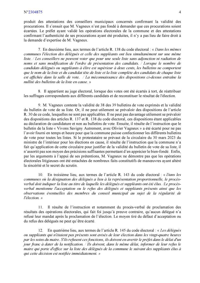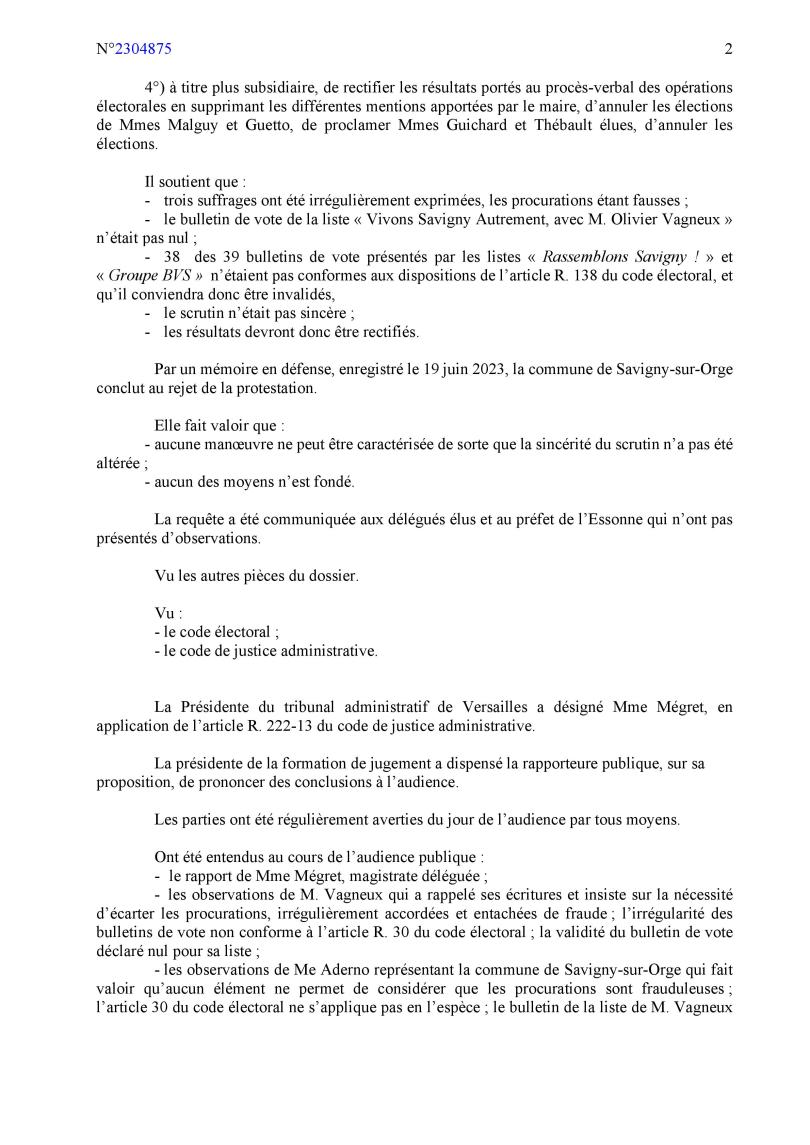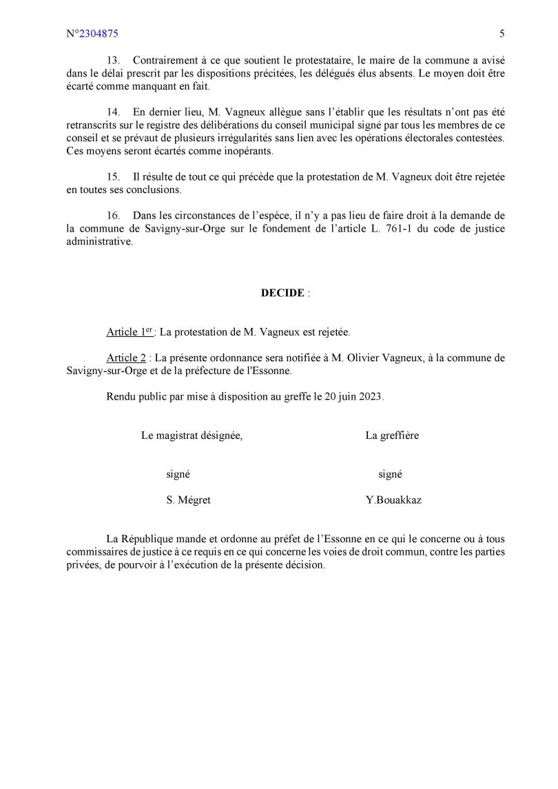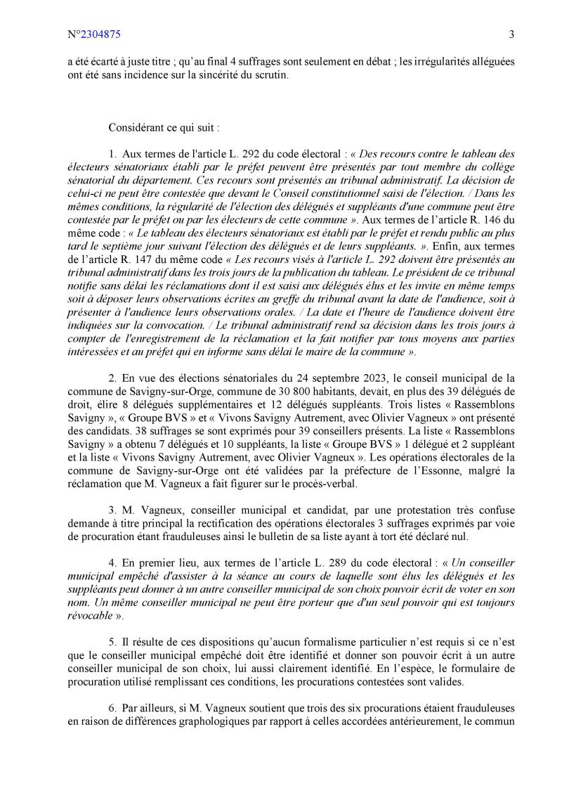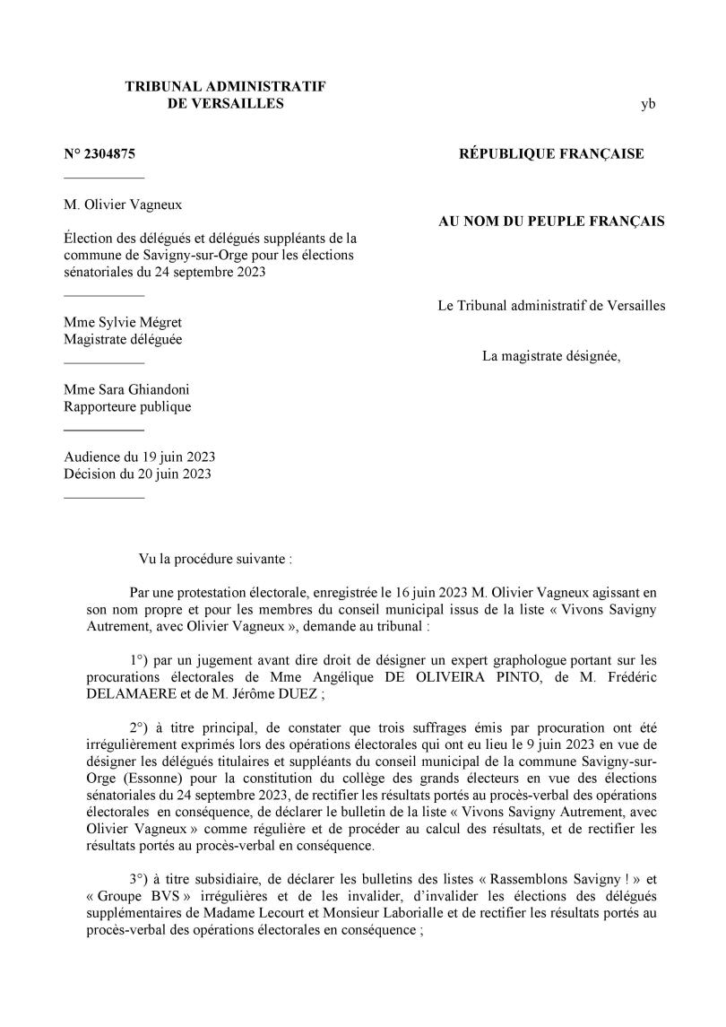 Ma protestation était peut-être confuse (non, je ne crois pas ; et d’ailleurs, je ne mens jamais car c’est toujours la vérité qui se trompe) ; mais en attendant, je suis notifié d’un jugement, rendu sur déféré préfectoral (alors que c’était ma protestation personnelle), qui met dans ma bouche des arguments de la Commune (pas très hygiénique, tout cela), et qui met dans la sienne, de mes arguments (là, ça devient carrément porno)… Où l’on apprend aussi que Savigny ne compte que 30 800 habitants, et que j’étais candidat, alors que je suis délégué de droit…