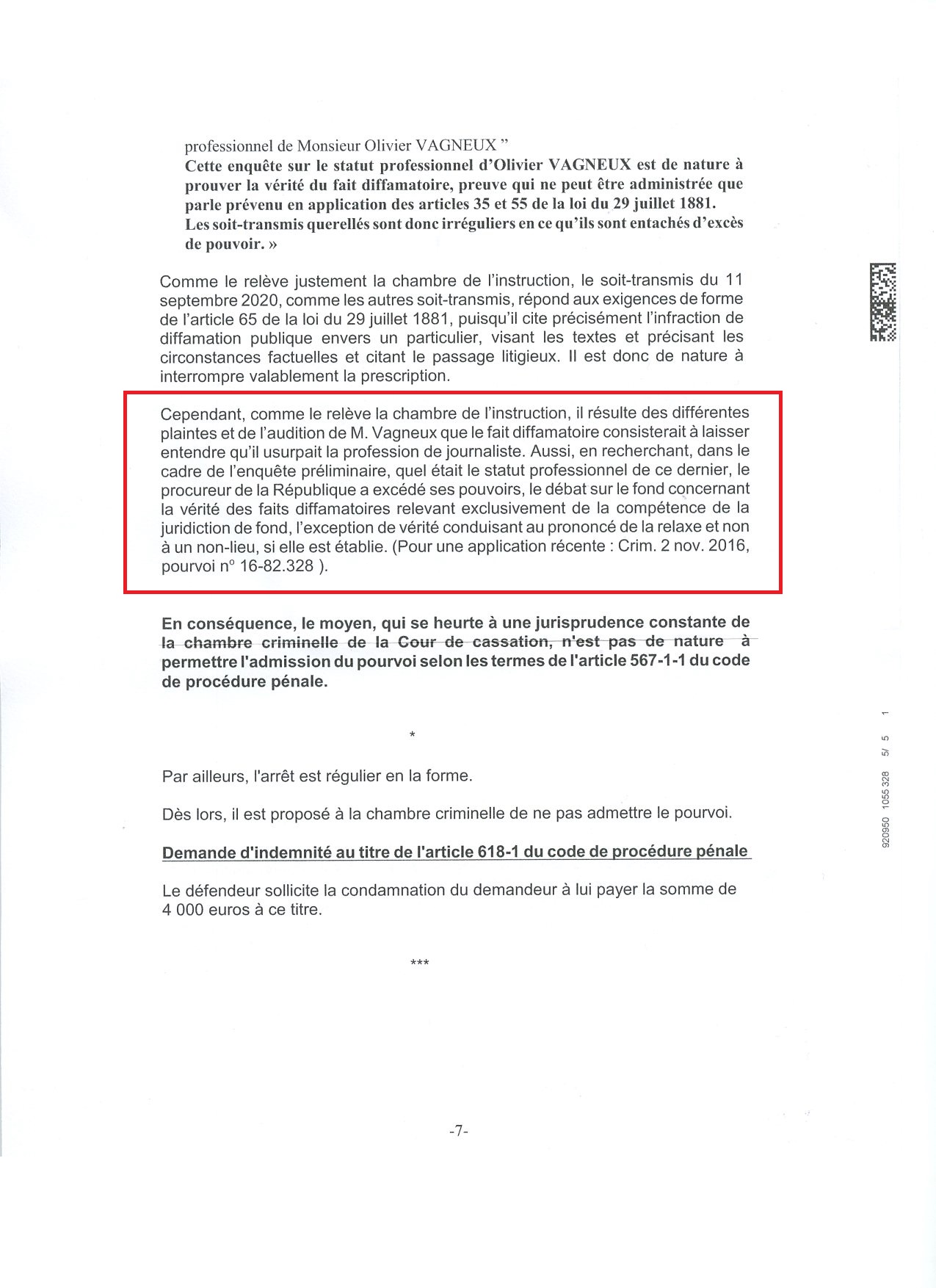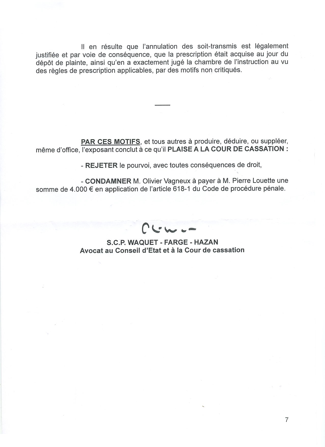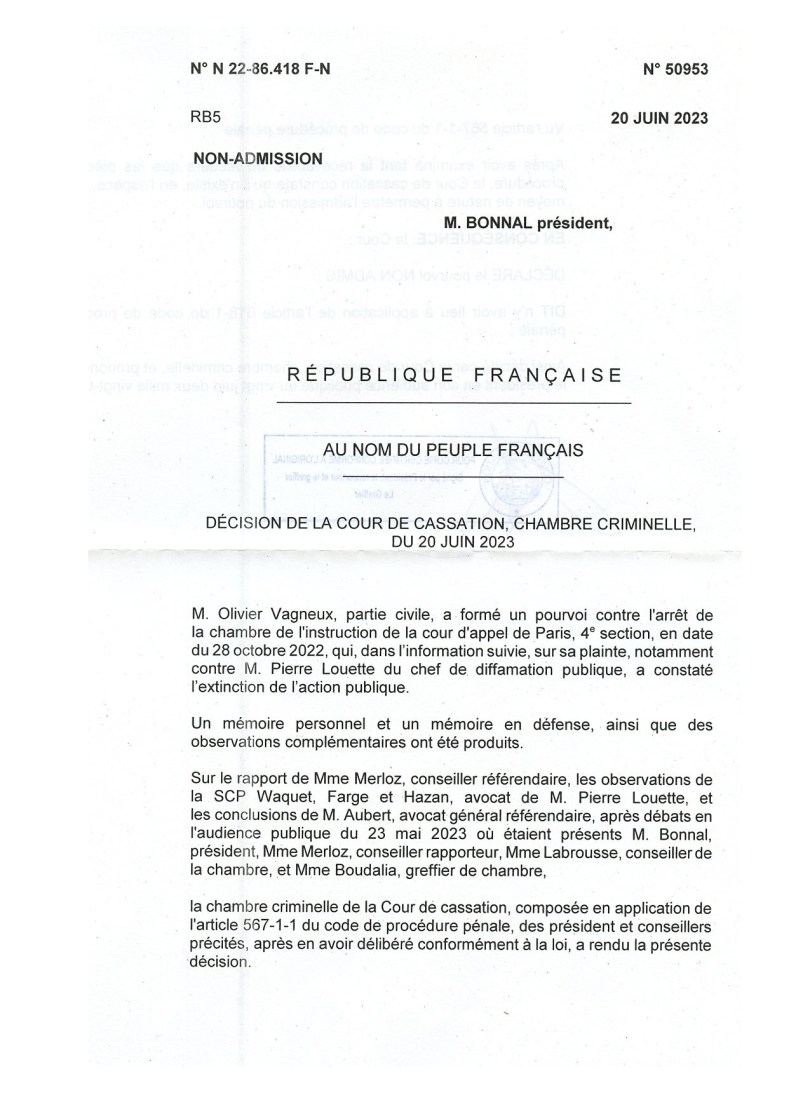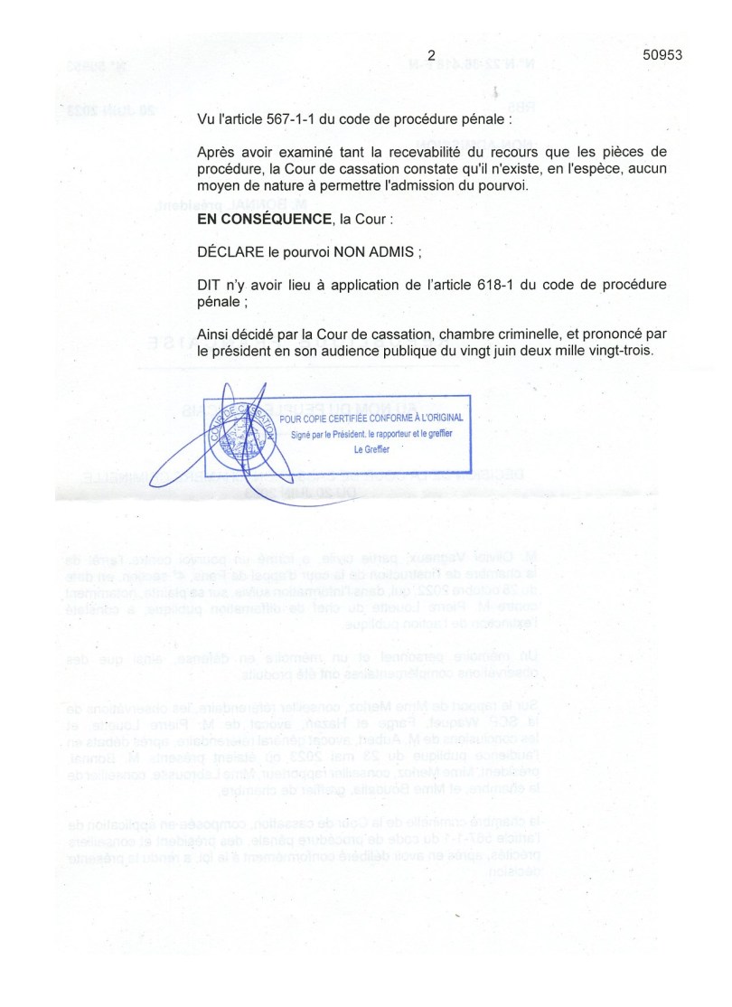 La Cour de cassation m’a notifié hier son arrêt : elle n’admet pas mon pourvoi, en tant que mon moyen se heurte à une jurisprudence constante de la Cour ; pour une erreur qui n’est pas de mon fait, mais qui s’est produit pendant l’enquête, du fait du Parquet…