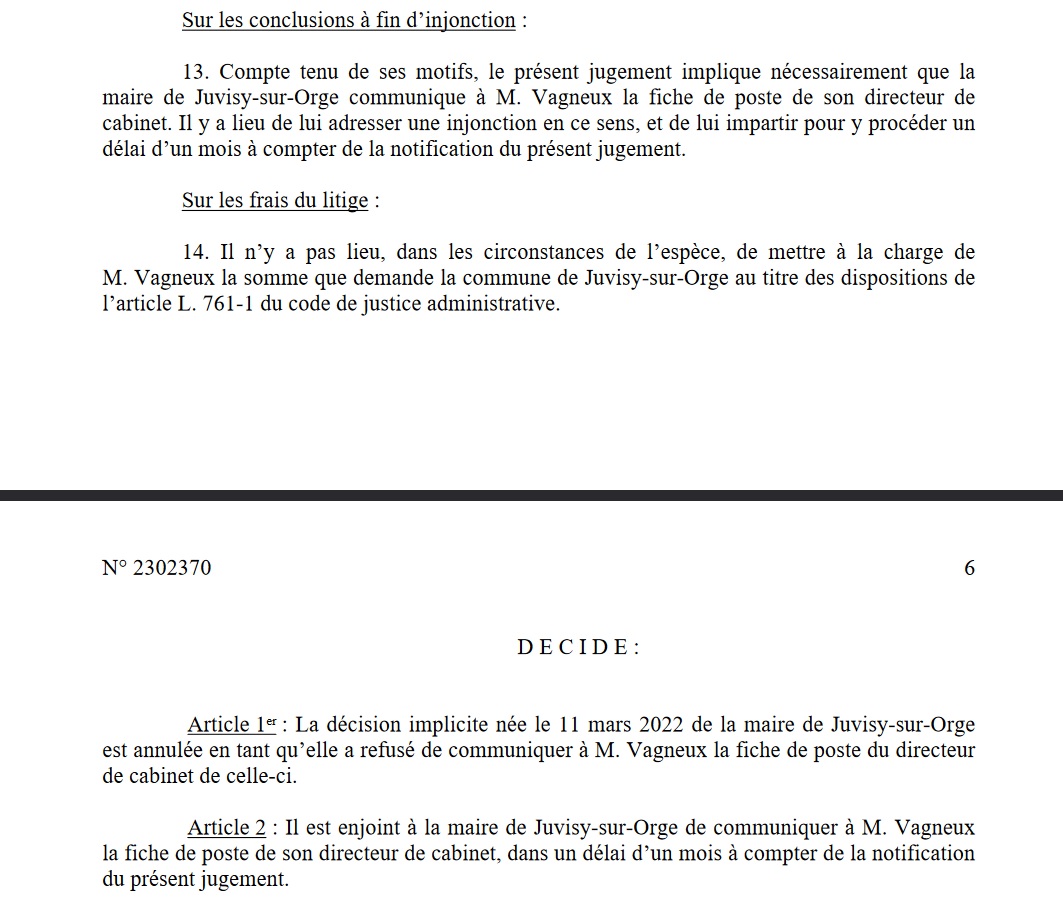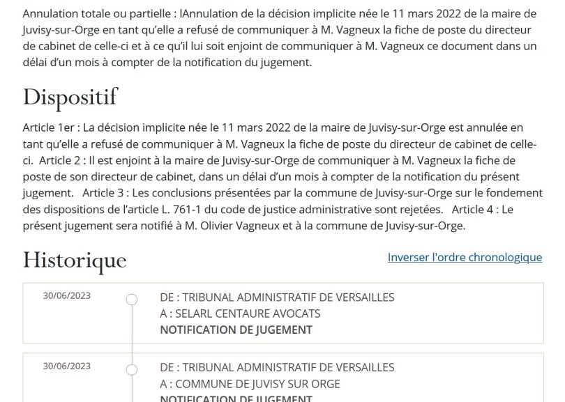 Par un jugement numéro 2302370 du 29 juin 2023, le Tribunal administratif de Versailles a enjoint à la maire de Juvisy-sur-Orge de nous communiquer la fiche de poste de son ancien directeur de cabinet ; un certain Alexis TEILLET, je ne sais pas si vous le connaissez.