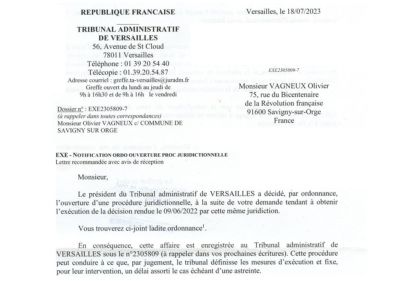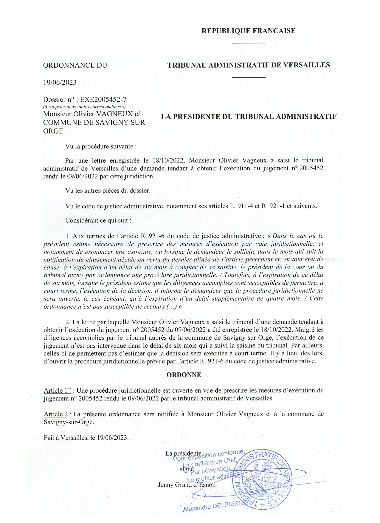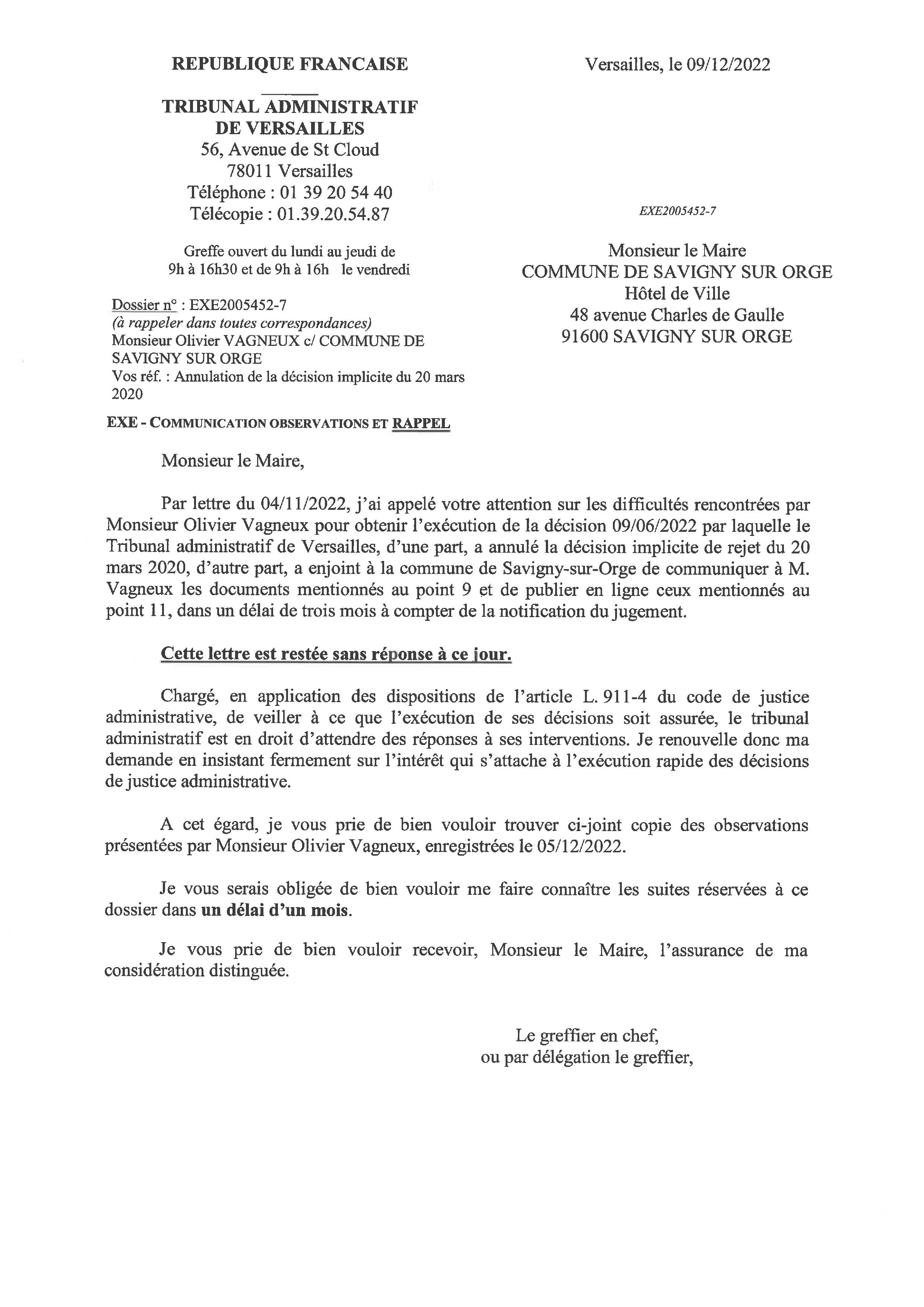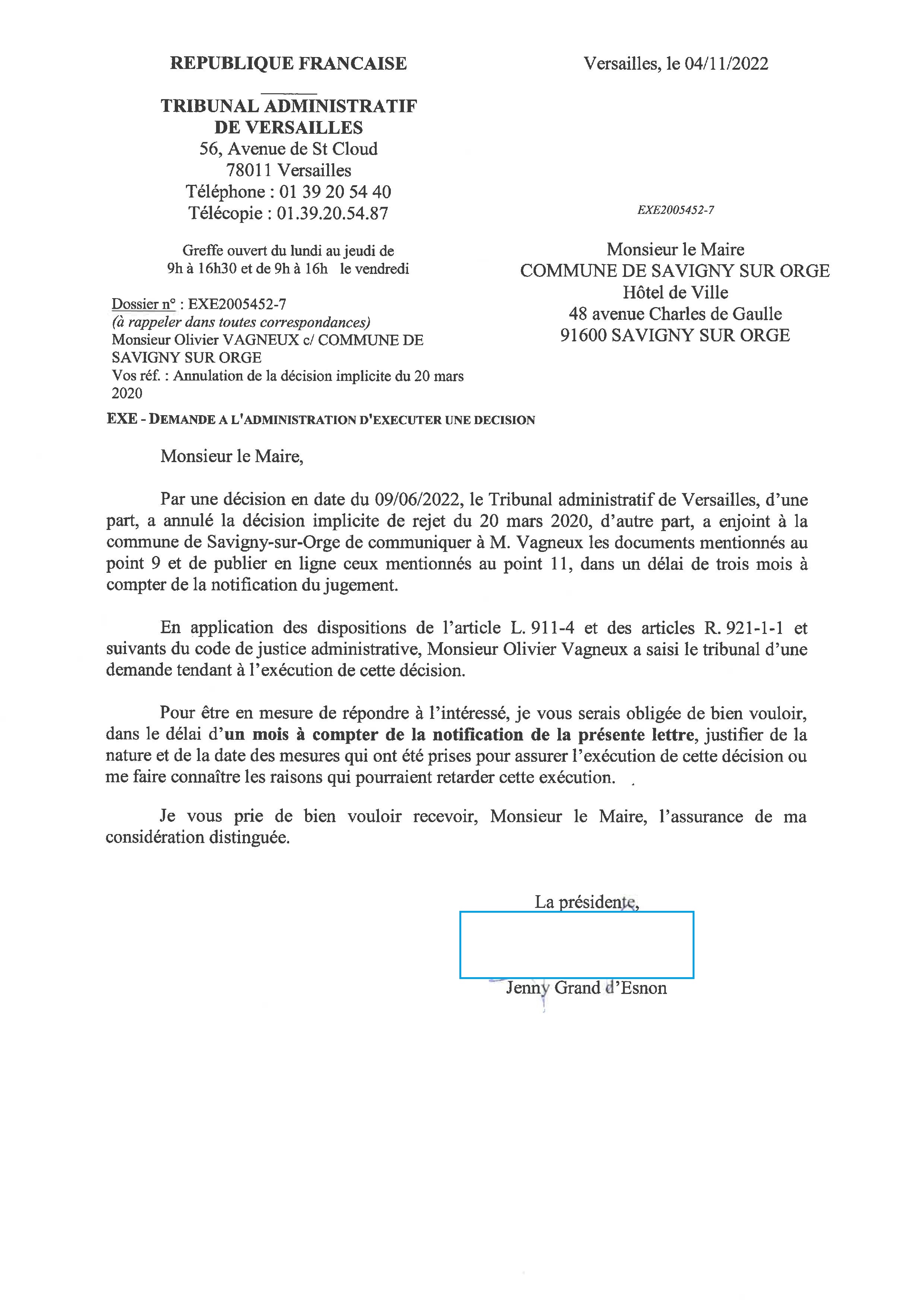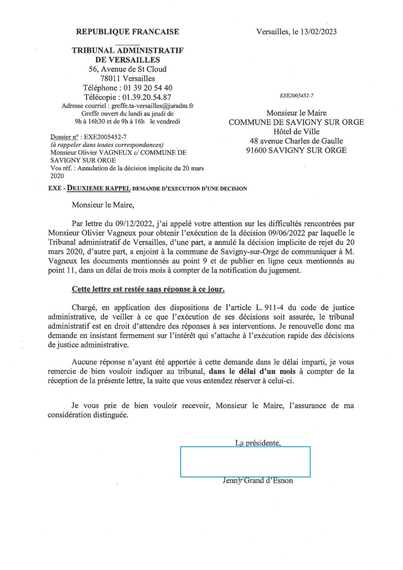 Voilà plus d’un an qu’Alexis TEILLET refuse d’exécuter un jugement du Tribunal administratif (de communication de documents produits par Valérie RAGOT) !