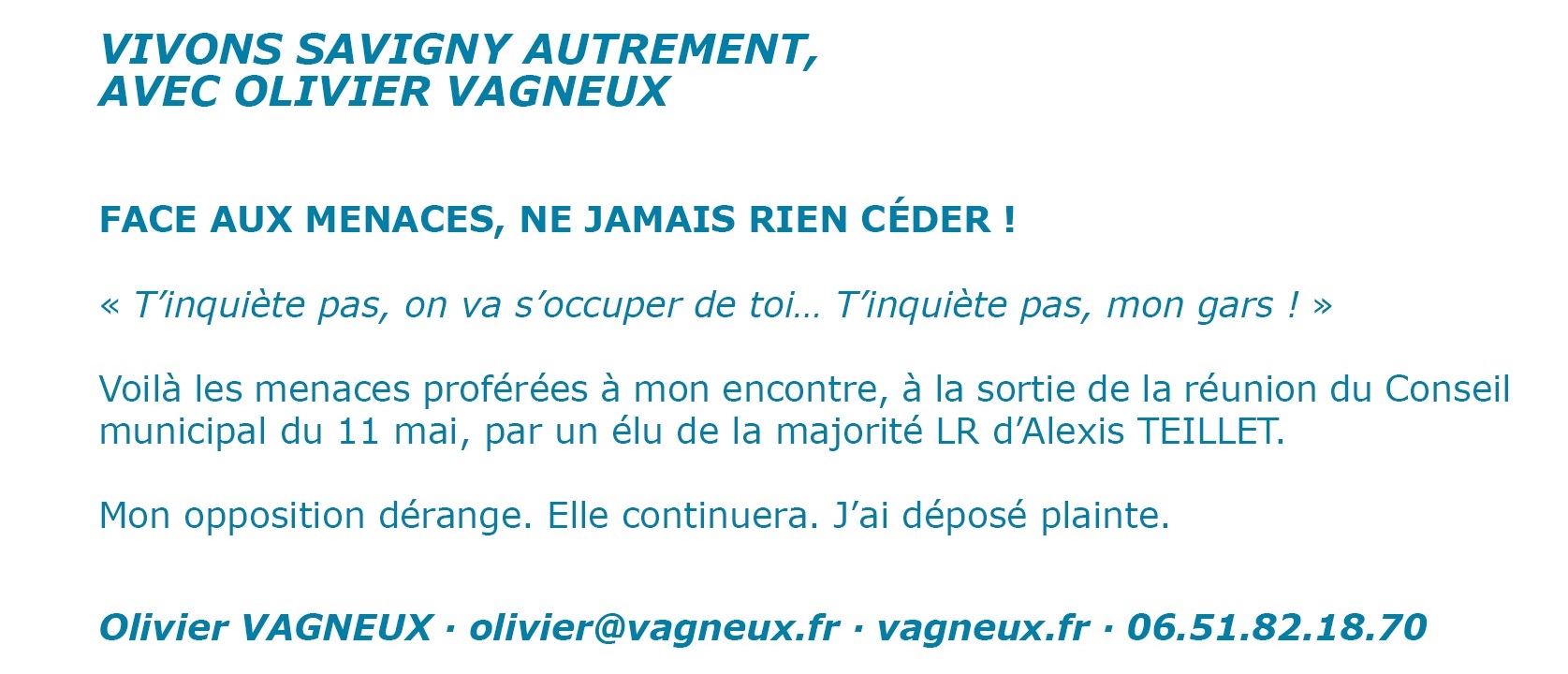 En tout état de cause, TEILLET ne pouvait convenablement pas dénoncer les violences faites aux élus, à partir du moment où je dis que sa liste en commet envers moi…