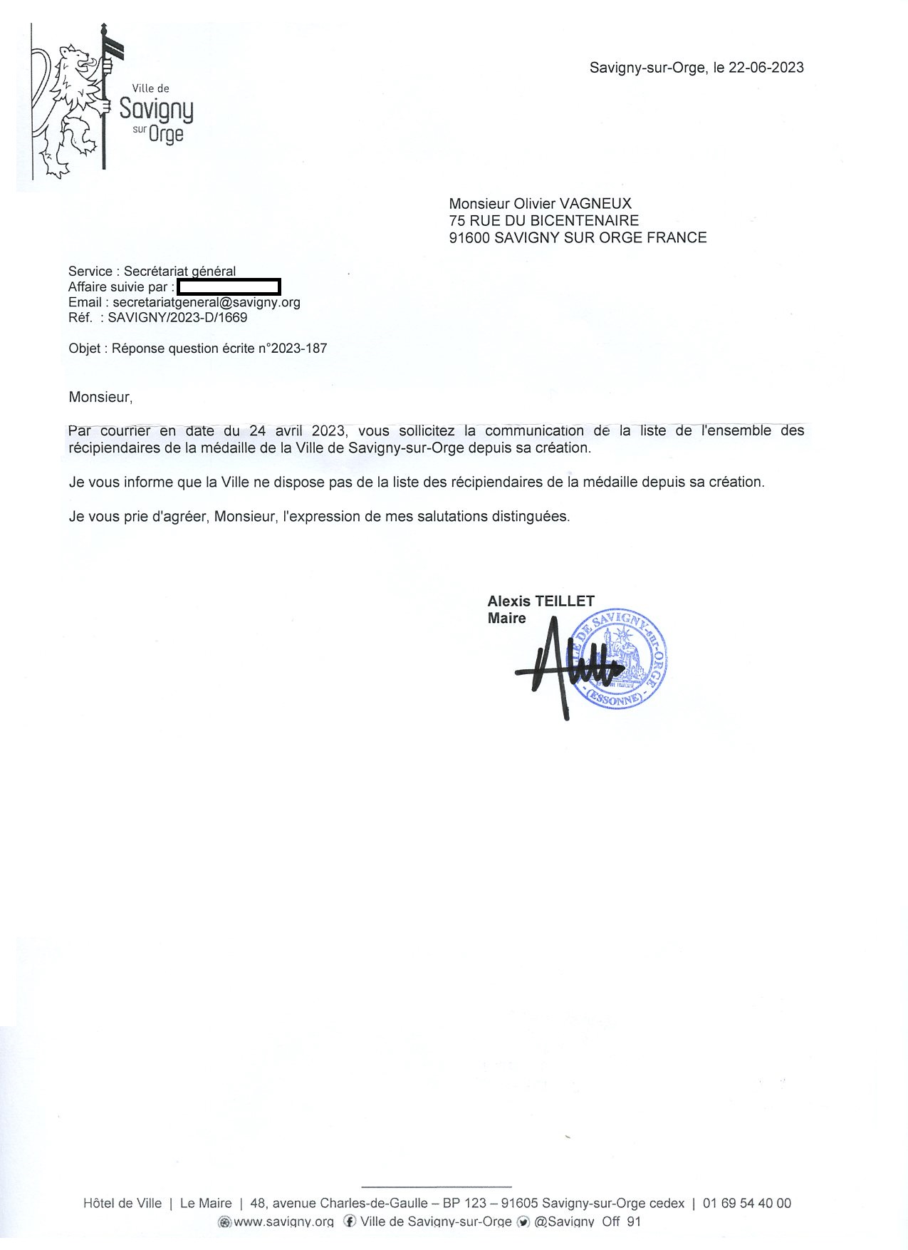 Surprenante découverte que celle que la Commune de Savigny-sur-Orge ne possède pas de liste des personnes à qui elle a remis des médailles de la Ville ; un pouvoir discrétionnaire du maire que je ne crois personnellement plus trop avoir sa place dans notre temps…
