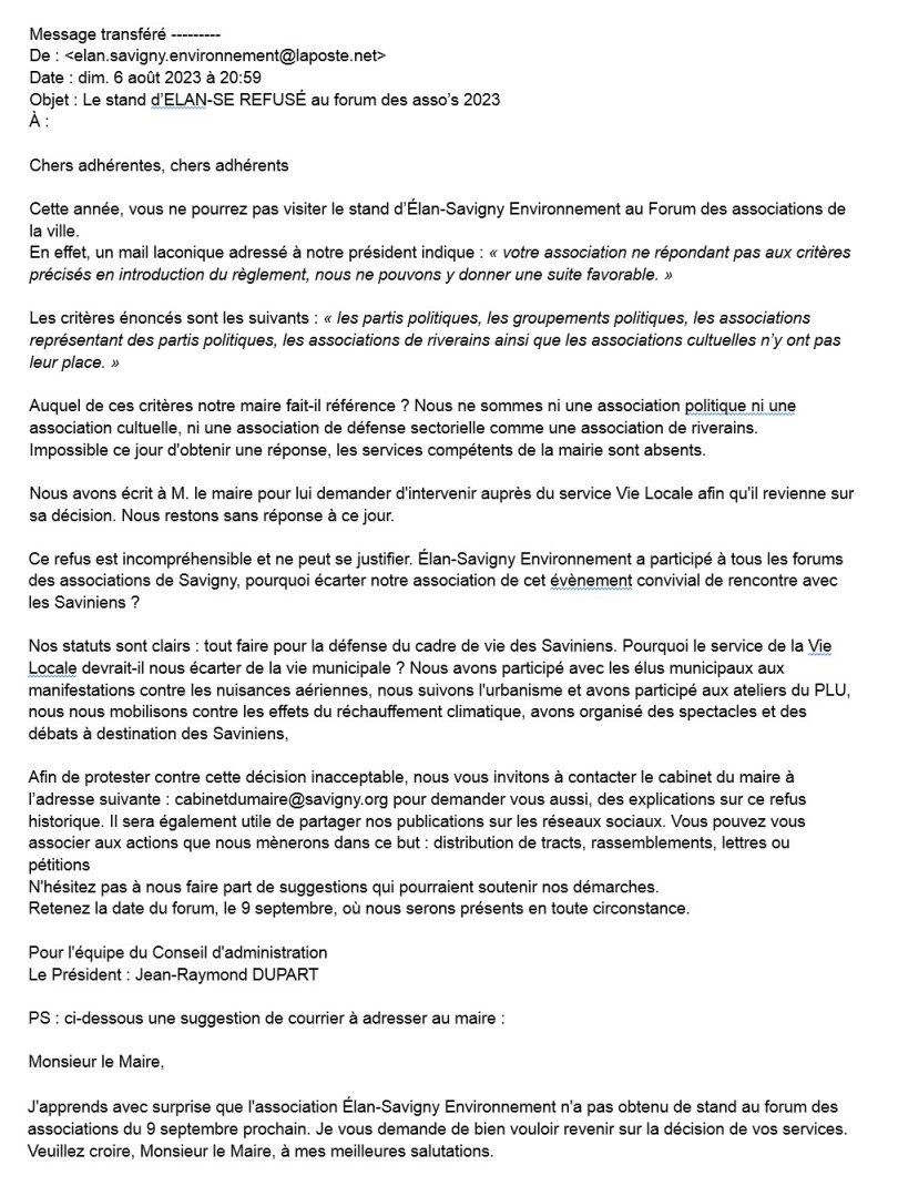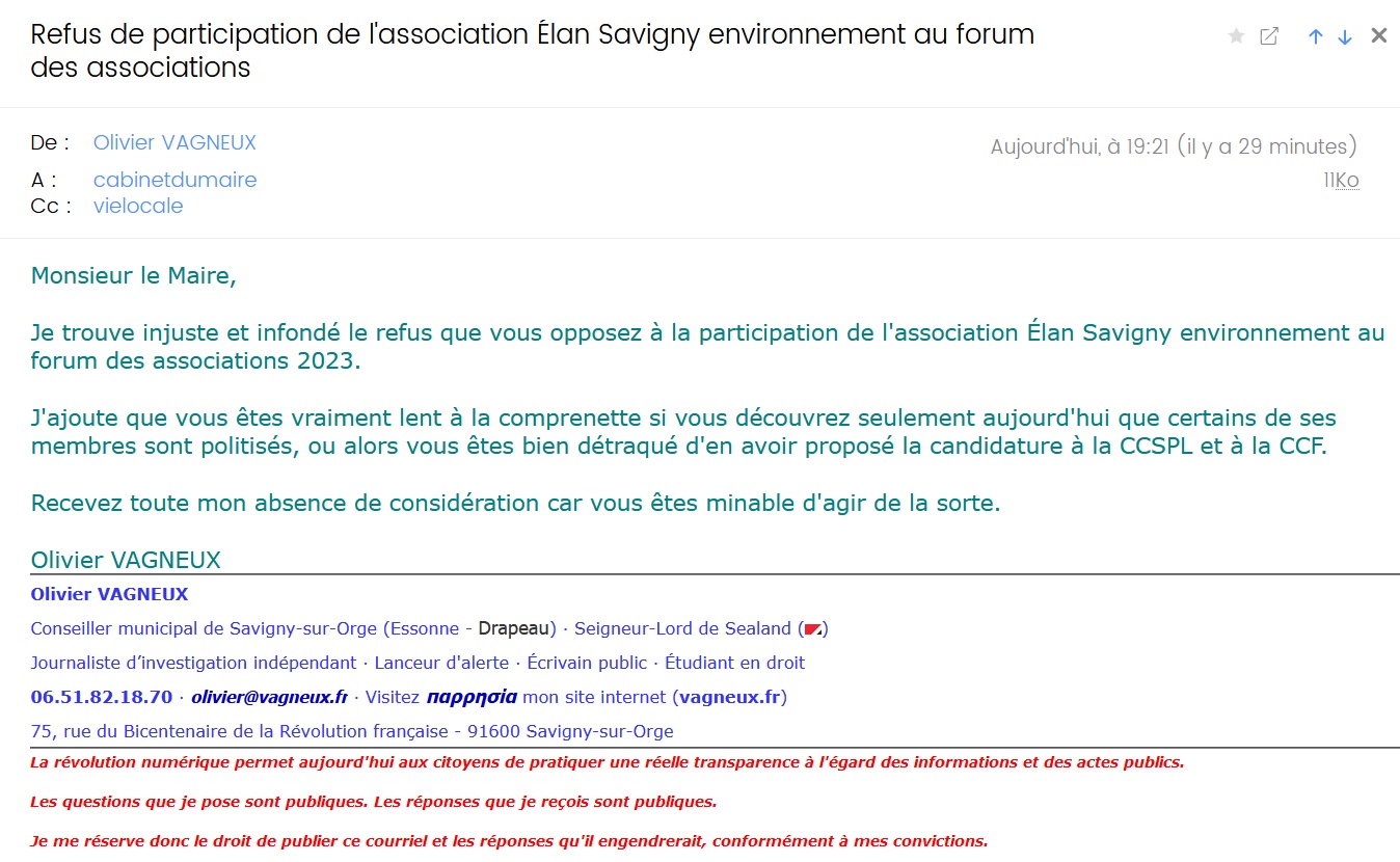 Carlo-Benito en ses œuvres de censure (# fascisme municipal) : il a décidé que l’association Élan Savigny environnement (ESE) n’aurait pas de stand au forum des associations 2023 de Savigny-sur-Orge, là où dans le même temps, il accepte des associations qui font pourtant ce qu’il semble reprocher à ESE.