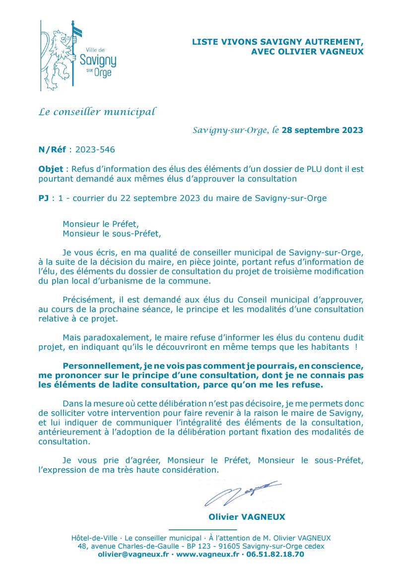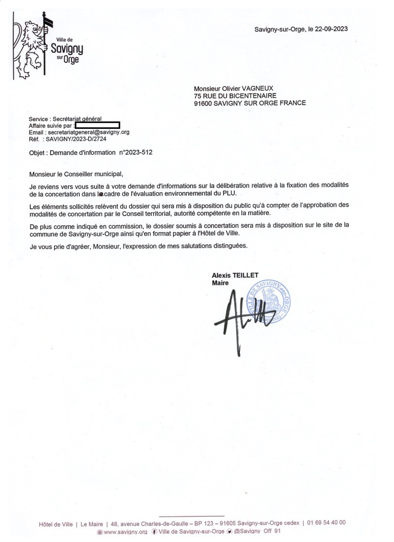 Je vous écris, en ma qualité de conseiller municipal de Savigny-sur-Orge, à la suite de la décision du maire, en pièce jointe, portant refus d’information de l’élu, des éléments du dossier de consultation du projet de troisième modification du plan local d’urbanisme de la commune.
