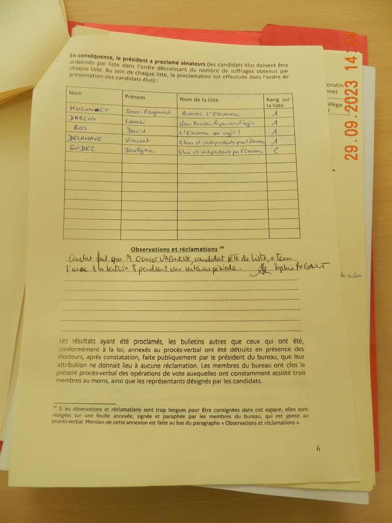 Je relève cependant que la directive des relations aux collectivités locales de la préfecture m’a parlé de plusieurs personnes ; et qu’elle a tourné le truc, non pas du fait que je sois candidat, mais que je ne sois pas l’assesseur le plus âgé.
