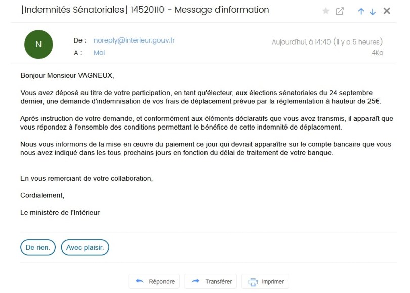 Pour rappel, seuls les élus qui ne perçoivent aucune indemnité de fonction sont éligibles à cette indemnité de déplacement ; que j’ai demandée et obtenue.