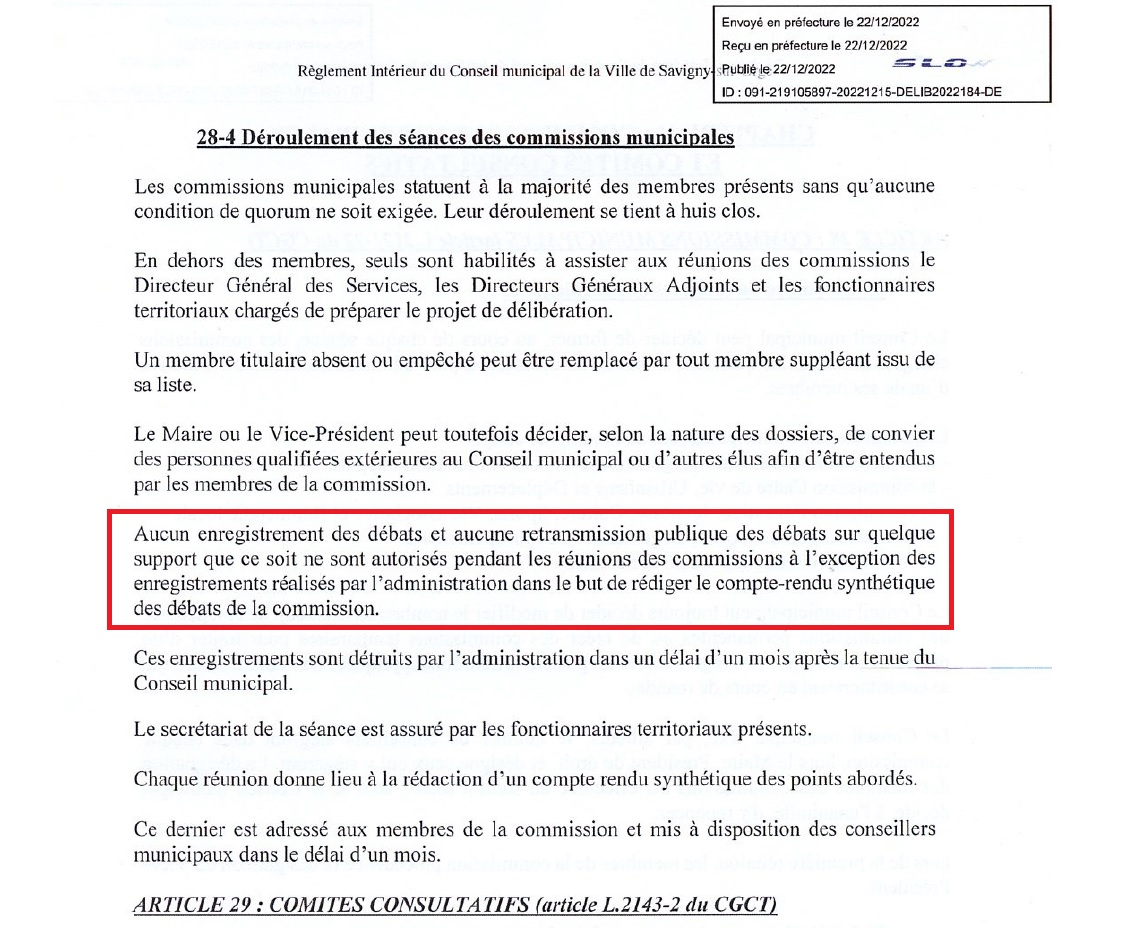 Dans le règlement intérieur du conseil municipal, à l’article 28-4 précisément, il est écrit que les commissions municipales font l’objet d’un enregistrement audio pour rédiger le compte-rendu.