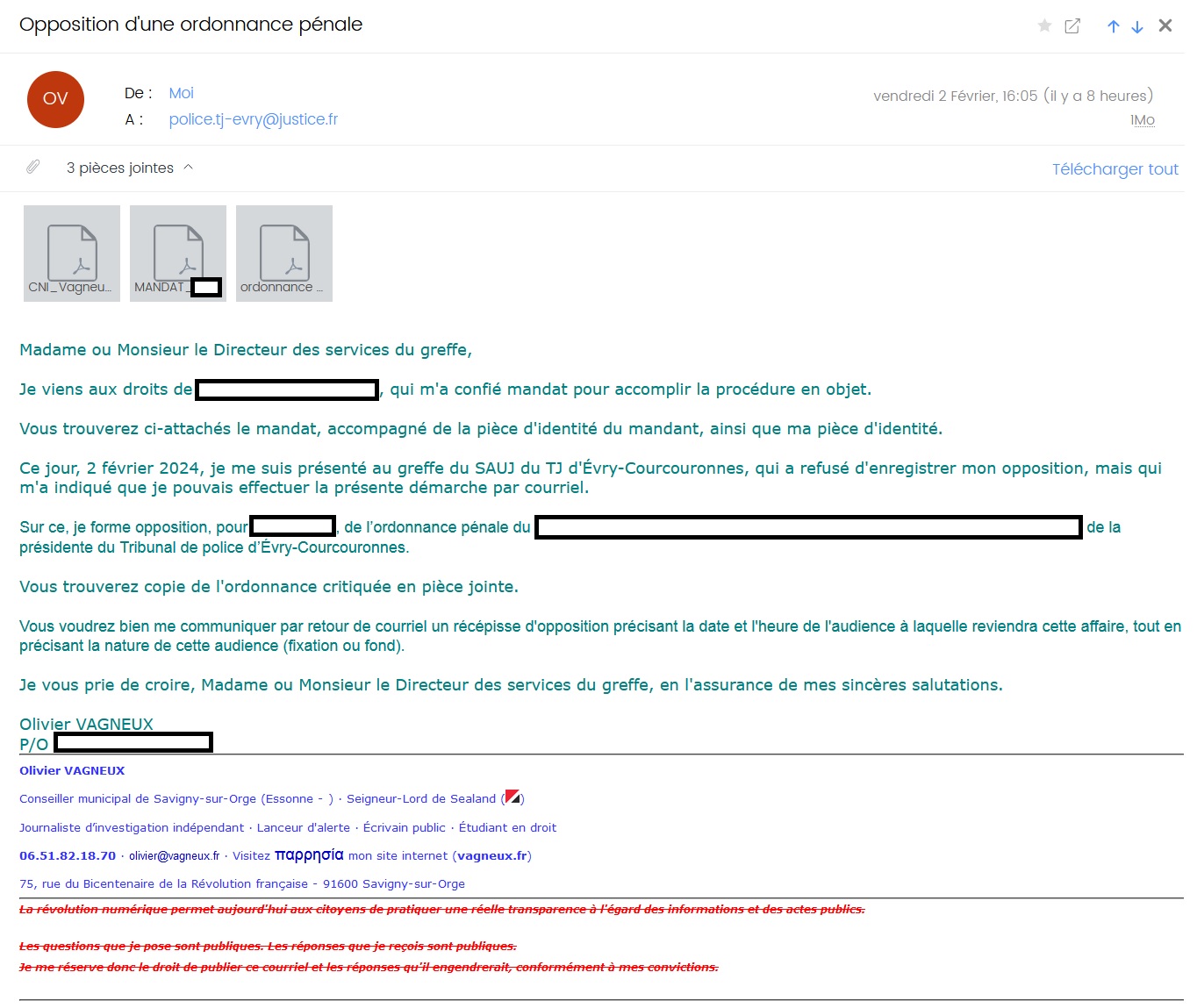 Cette après-midi du vendredi 2 février 2024, j’étais au Tribunal judiciaire d’Évry-Courcouronnes (Essonne) pour former opposition à une ordonnance pénale, agissant sur le pouvoir spécial d’un tiers, qui m’avait mandaté à cette fin.