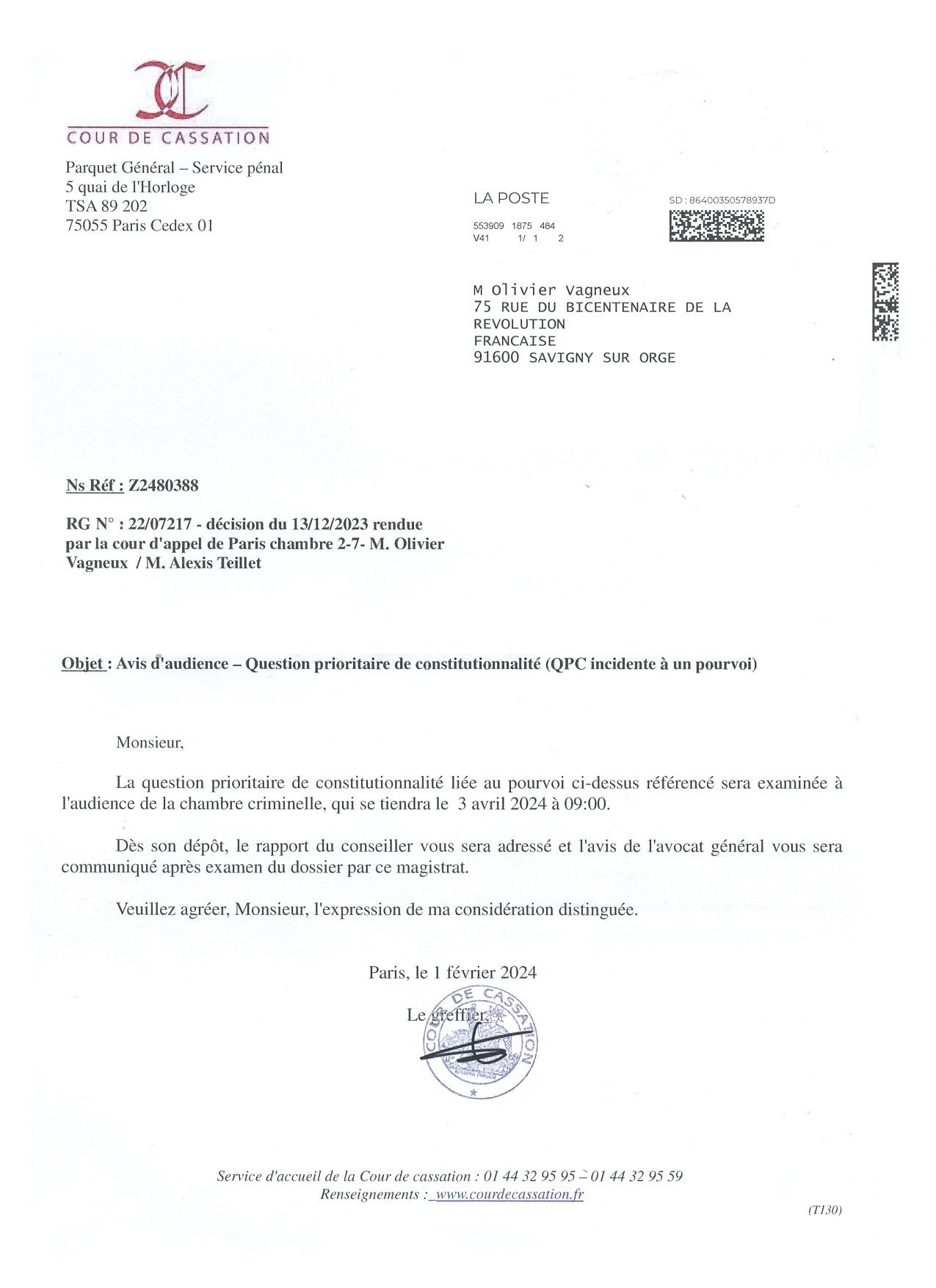 En effet, ce sera donc le 3 avril 2024, à l’issue de l’audience de 9 heures 00, que la chambre criminelle de la Cour de cassation va décider du sort de mes QPC.