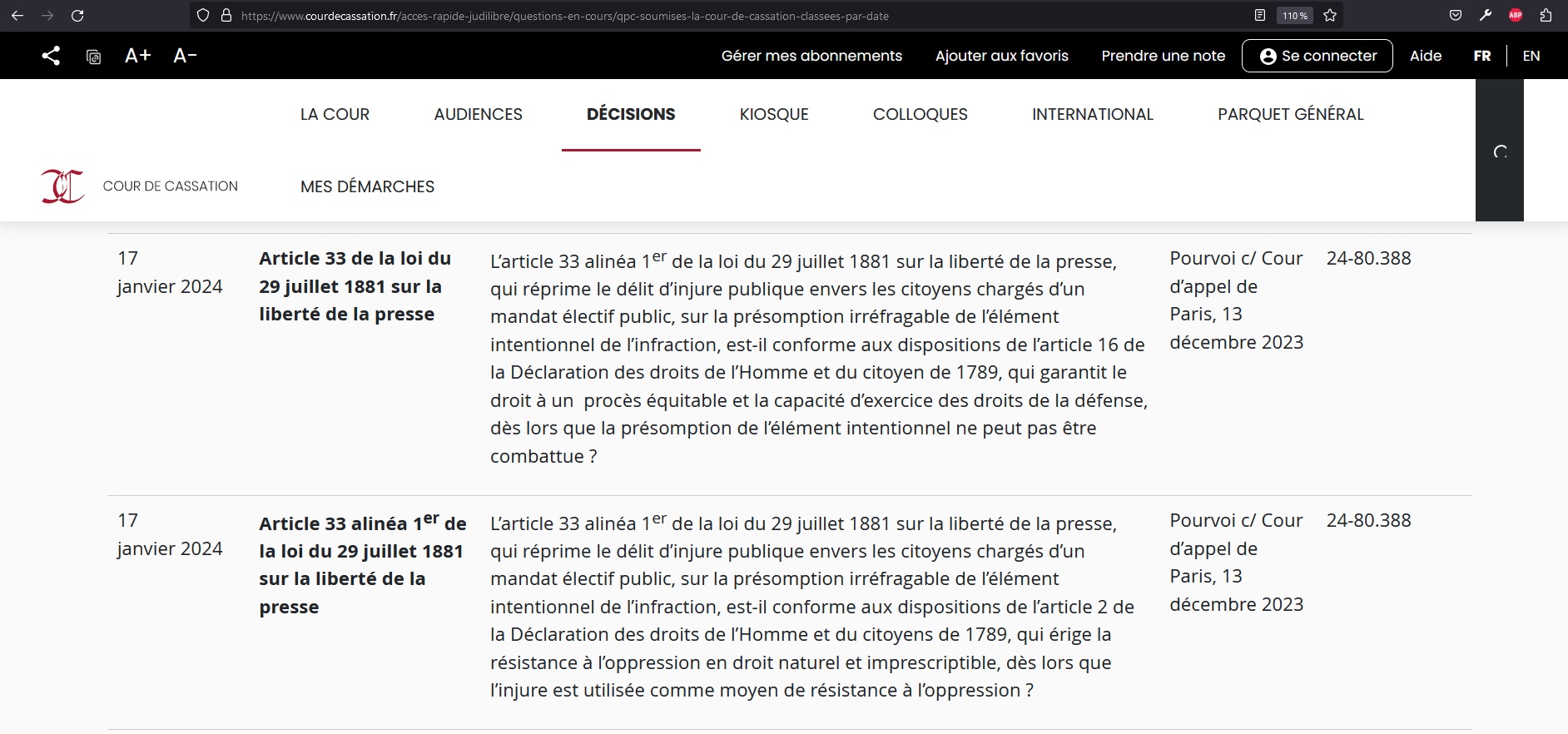 Vous pouvez retrouver le texte de mes deux QPC sur le site internet de la Cour de cassation ; et vous pourrez en suivre l’issue également.