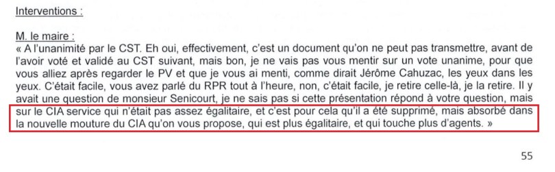 « (…) sur le CIA service qui n’était pas assez égalitaire, et c’est pour cela qu’il a été supprimé, mais absorbé dans la nouvelle mouture du CIA qu’on vous propose (…) »