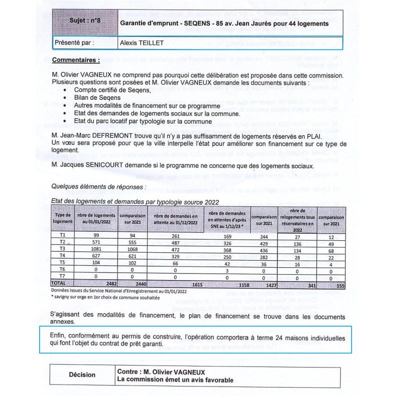 que la société anonyme d’habitations à loyer modéré Seqens, avait demandé une garantie d’emprunt sur un premier projet (l’immeuble de 44 logements sociaux du 85 avenue Jean-Jaurès), pour en fait financer un deuxième projet (de 24 logements individuels, qui serait situé sur le même site).