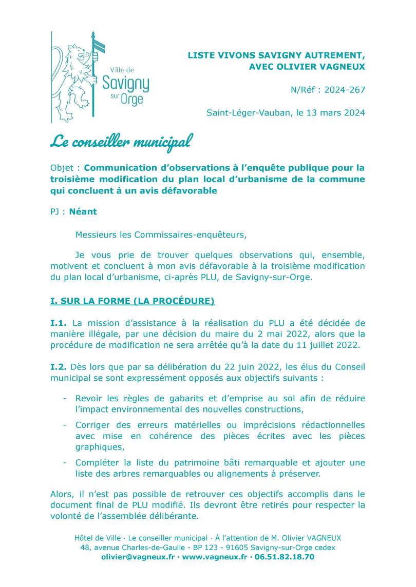 Je vous prie de trouver quelques observations qui, ensemble, motivent et concluent à mon avis défavorable à la troisième modification du plan local d’urbanisme, ci-après PLU, de Savigny-sur-Orge.