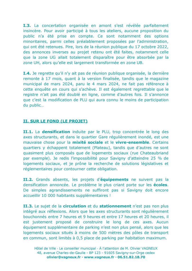 II.1. La densification induite par le PLU, trop concentrée le long des axes structurants, et dans le quartier Gare régulièrement inondé, est une mauvaise chose pour la mixité sociale et le vivre-ensemble. Certains quartiers y échappent totalement (Plateau), tandis que d’autres ne sont quasiment plus composés que de logements sociaux (rue Chateaubriand par exemple). Je redis l’impossibilité pour Savigny d’atteindre 25 % de logements sociaux, et je prône la recherche de solutions législatives et réglementaires pour contourner cette obligation.